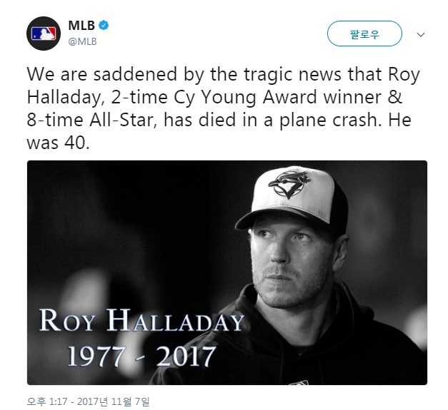 Blue Jays and Phillies great Roy Halladay died today in a plane crash in the Gulf of Mexico, according to Pasco County (Fla.) Sheriff Dept. 안녕하세요 김치찌개입니다! 이건 또 무슨 날벼락인가요 할교수님이 비행기 추락사고로 사망했다는 소식이네요ㅠㅠ 삼가 고인의 명복을 빕니다 할교수가 탔던 비행기 사진 추가. 1