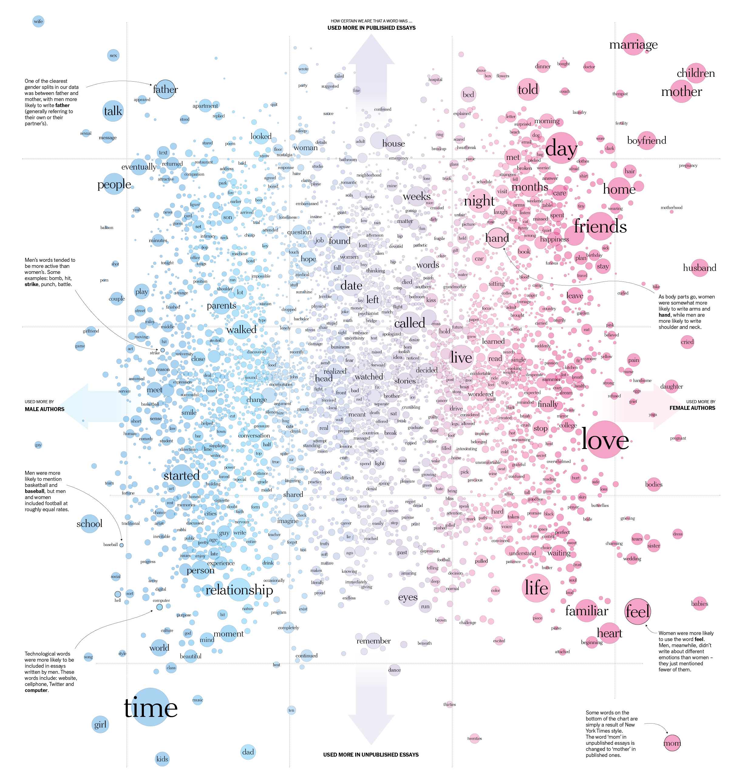 재미있는 칼럼인 것 같아 올려봅니다. 위 링크에 따르면, 뉴욕 타임즈에는 '모던 러브'란 코너가 있다 하네요. 저는 안 봐서 모르겠는데, 서술된 것을 보면 독자들이 자신의 연애 경험을 소개한 글들을 기고하면 그 중에 괜찮다 싶은 것을 타임즈가 선별해서 지면에 올리는 식인 것 같습니다. 이렇게 독자들이 보내온 에세이를 4년 동안 차곡차곡 모은 뒤, 사용된 어휘들을 몽땅 통계화시킨 다음 성차를 가늠해보았다고 하네요. 본문 상단의 그림이 이것을 시각화한 것입니다. 좌측은 남성들이, 우측은 여성들이 자주 쓴 어휘죠. 상단은 실제로 발행된 에세이에 실린 것이고 하단은 편집당한 에세이에 실린 어휘들이고요. 대표성 있게 정리해보면