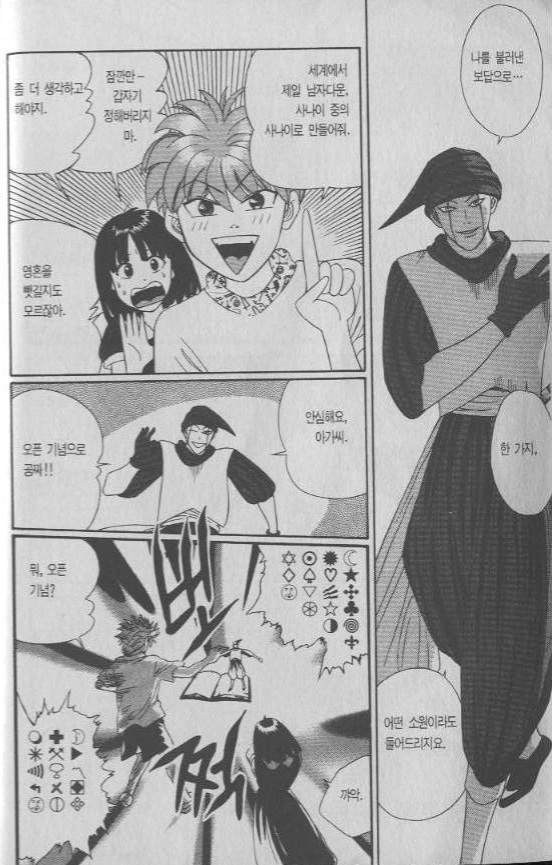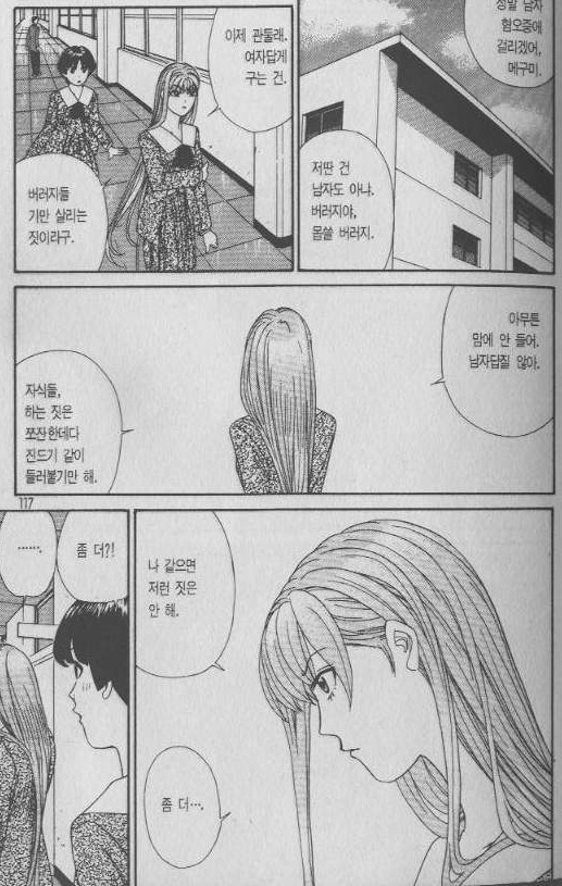 만화책 이야기입니다. '건방진 천사' 라는 만화가 있어요. 니시모리 히로유키가 '오늘부터 우리는'을 완결시킨 이후에 그린 후속편이라 할까요. 나름 꽤 유명한 만화라 제가 이제와서 이걸 소개한다고 하기는 뭣하고 이 만화를 보는 저의 관점에 대해 이야기해보려 합니다. 저는 이 만화를 보는 사람은 누구나 다 저처럼 똑같이 생각할 줄 알았는데 의외로 저같은 사람을 만난적이 없어서 제 생각이 독특한 것인가 싶어서요. 당연히 스포 있습니다. 출간된지 20년 가까이 되는 만화라 별 상관 없다고 여겨지지만 아무튼.. . . . 9살 소년 메구미는 피아노레슨을 빼먹고 소꿉친구 미키와 거리를 노다니다가 마법사 행색을 한 아저씨가 또래 아이들에게 괴롭힘당하고 있는 것을 보고 구해줍니다. 아저씨는 보답이라며 마법 책 같은 것을 주는데 아이들과 싸우며 생긴 상처에서 피가 흘러 책에 묻자 책 속에서 삐에로가 나와 소원을 하나 들어주겠다고 합니다. 메구미는 일말의 주저도 없이 <세상에서 가장 남자다운 사람, 사나이 중의 사나이>로 만들어 달라고 부탁합니다. 그런데 삐에로는 무슨 심술에서였는지 아니면 그냥 실수였는지, 메구미를 <가장 여자다운 여자>로 만들어버립니다. 메구미의 아름다운 외모를 보고 경악하는 미키, 미키의 반응을 보고 자신이 여자가 되어버렸다는 사실을 알게된 메구미는 걱정에 가득차 집에 돌아와서는 어머니에게 이실직고를 하는데, 이게 어찌된 일입니까.. 어머니는 넌 원래 여자였는데 무슨 소리냐고 그러네요.. 어머니뿐만 아니라 메구미를 아는 모든 사람들이 메구미는 여자였다고 알고 있습니다. 사진 같은것도 모두 여자로 바뀌어져 있고, 삐에로 사건을 아는 사람은 단 한사람, 곁에 있었던 소꿉친구 미키 뿐입니다. 그렇게 여자인채로 성장해 고등학생이 된 메구미. 초등학생때와는 비교도 안되게 여성적 매력이 흘러 넘치고 있지만 <가장 남자다운 사람>이 되고자 하는 바람에는 흔들림이 없습니다. 불의를 보면 참지 못하는 성격에 학교 내외에서 벌어지는 이런저런 남자들의 싸움에 끼어들고 그 과정에서 지역 제일의 깡패 겐조를 알게 됩니다. 겐조는 당연하게도 메구미에게 홀딱 반해버리고 겐조 이외에도 후지키(가장 평범한 남자) 야스다(오타쿠) 코바야시(무도인) 모두 네 명의 남학생이 메구미와 친해지고 싶어 그녀의 주변을 멤돕니다. 메구미는 이미 전교생의 여신입니다. 남자들에게는 말할 것도 없고 같은 여자들 사이에서도 메구미의 아름다움은 동경의 대상입니다. 하지만 여자로서의 인기와 위상이 높아질수록 <가장 남자다운 사람>을 꿈꾸는 메구미의 좌절은 깊어갑니다. 가장 가까운 친구 미키마저 그냥 여자답게 살아가라고 부추깁니다. 일부러 말투를 거칠게도 해보고 폭력적 성향도 내보이지만 아무런 소용이 없습니다. 그런 것이 남자다움의 본질이 아닌 것은 메구미 자신도 알았구요. 하지만 상황이 악화될수록 메구미의 남자를 향한 열망은 더욱 커져 갑니다. 메구미에게 대시하는 수많은 남자들은 <남자라는 것이 고작 이런 존재였단 말인가, 내가 되고 싶었던 것이 겨우 이거였다고?> 라고 실망감만 안겨 주는 동시에 <이 세상에 남자다운 남자가 없다면, 더더욱 나 자신이 그런 남자가 되고 싶다>는 각오를 다지게 합니다. 포기를 모르고 자신을 쫓아다니는 겐조,후지키,야스다,코바야시에게 메구미는 드디어 자신이 남자임을 밝힙니다. 물론 아무도 믿지 않죠. 마법 책을 받아서 삐에로가 나타나 자신을 여자로 만들었다는 이야기를 누가 믿겠습니까. 하지만 메구미가 너무나 절박하게 믿어 달라고 하소연하는데다 그녀를 진심으로 좋아하는 네명의 남자들이었기 때문에 결국 그 문제를 어떤 의미로든 진지하게 생각할 수밖에 없었습니다. 메구미의 주장을 허튼소리로 치부한다면 그녀에게 다가갈 길은 아주 막혀버리기 때문이었지요. 메구미를 좋아하는 네명의 남자들에게는 메구미가 원래 남자였느냐의 문제와 함께, 메구미가 꿈꾸는 이상적인 남자상에 자신들이 얼마나 부합할 수 있느냐의 문제가 당면과제로 떠오르게 됩니다. 그들 중 누구 하나가 <가장 남자다운 남자>가 될 수 있다면, 그것으로 메구미에게 인정받을 수 있으면서 잘하면 메구미로 하여금 자신이 여자란 사실을 인정케 만들 수 있으리라는 기대까지 품게 되지요. 그리하여 메구미와 네명의 남자들은 <사나이도>측정을 통해 <누가 먼저 남자 중의 남자가 되는지> 경쟁을 벌이게 됩니다. 메구미가 이 제안을 받아들인 것은 아직은 소년?인 그녀에게 승부를 겨룬다는 요소가 흥미롭기도 했고, 그때까지만 해도 다른 남자들이 너무 한심해 보였기 때문에 자신의 압도적 승리에 대한 확신이 있어서였지요. 이렇게 시작된 남자답기 경쟁 - 학원 최고의 미소녀와 그녀를 추종하는 네명의 성별만 남자인 학생들간의 -은 다양한 에피소드들을 통해 <과연 남자다움이란 무엇인가>에 대한 문제제기를 하고, 작가 자신의 주관적이고 불완전한 대답이긴 하지만 대체로 <남자다움>이란 남자들만의 전유물이 아닌, 인간이라면 누구나 추구해야 할 이런저런 미덕들을 고루 아우르고 있음을 보여 주는