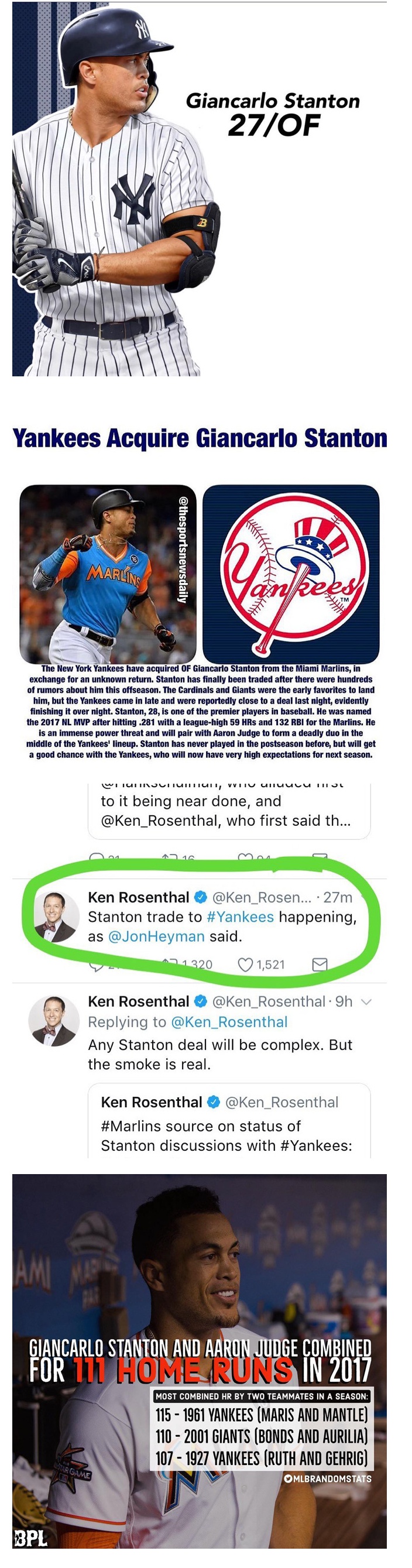 지안카를로 스탠튼 트레이드 합의.. 안녕하세요 김치찌개입니다! 오타니는 에인절스 확정 그리고 과연 어느팀을 갈지 뜨거운 감자였던 스탠튼이 결국 양키스로 갔습니다 올시즌 양대리그 홈런왕인 스탠튼과 저지과 양키스 한팀에서 보다니 벌써부터 기대가 됩니다 sources: yankees and marlins have a deal for giancarlo stanton 0