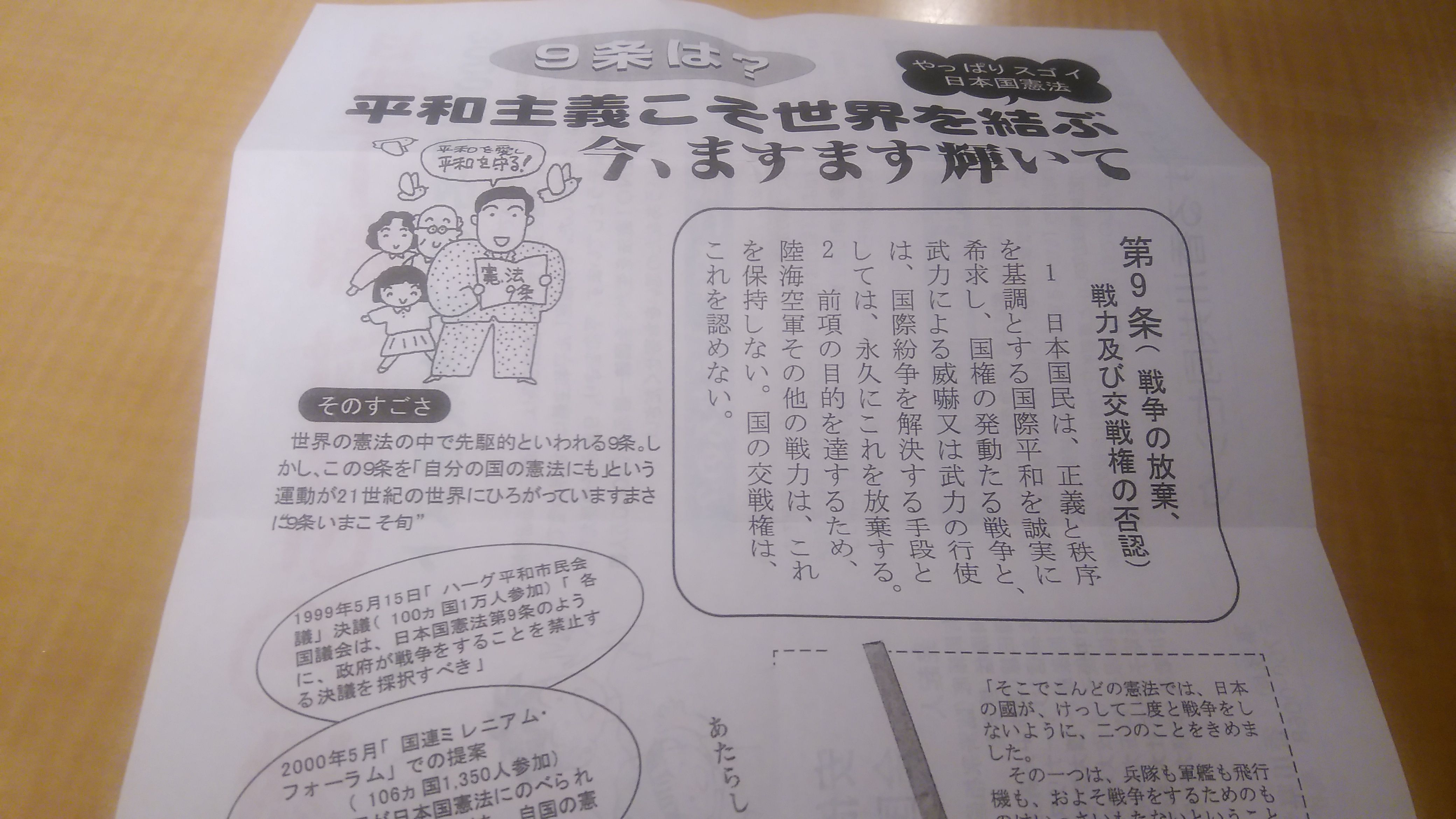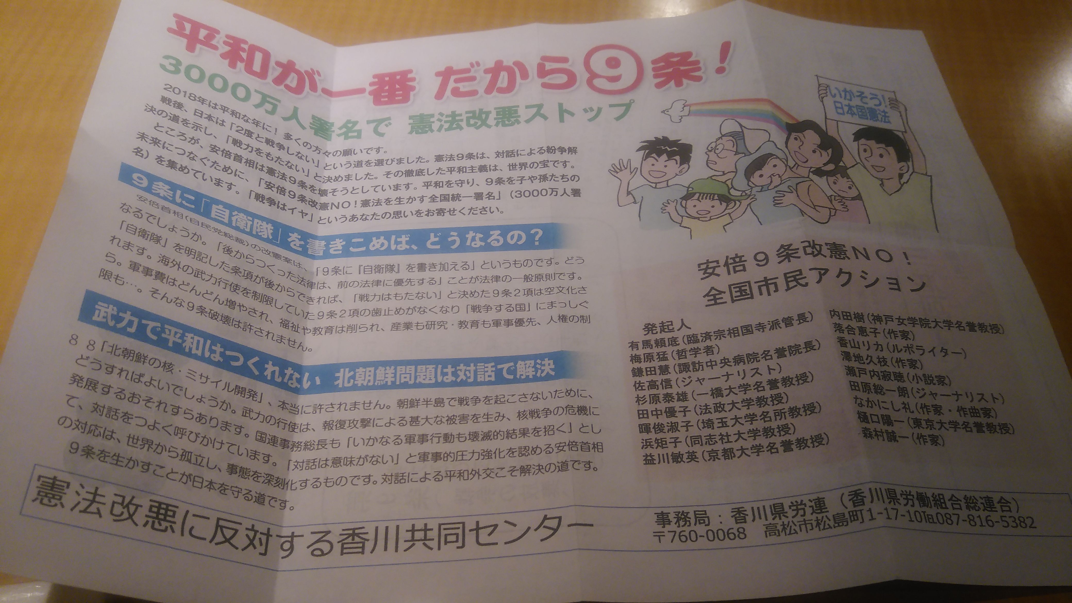 인천공항에서 활주로 문제로 10분쯤 늦게 출발했습니다. 수화물은 늦게 나왔고, 세관에서는 FM으로 검사를 받으면서 다카마츠공항에서 뭘 하면서 리무진을 기다리나 하던 고민은 쓸데없는 기우가 되었습니다. 다카마츠역에서 내려 여행자안내소를 들리려다 시간이 없음을 깨닫고 발을 돌려 후다닥 페리를 타러 선착장으로 갔습니다. 이때 이리저리 돌던 저에게 어느 일본인이 하얀 티슈 두 뭉치를 내밀었습니다. 정신이 없어서 남자인지 여자인지도 모르겠고 하얀 티슈 안에 뭐가 들어있나 생각도 안 해봤습니다. 페리 안에 자리를 잡아 허기를 달래고 시간에 쫓겨 무얼 놓쳤는지, 어디서 대신할 수 있는지 점검하다 아까 받은 티슈가 생각났습니다. 꼬깃꼬깃 접힌 종이를 열어봅니다. [평화가 제일 그러니까 9조! 3000만명 서명으로 헌법개악 스톱] 응? 안되는 일본어를 한자로 비비고 번역기를 써가며 한 문장씩 읽어봅니다. 그렇습니다. 이 종이는 소위 '평화헌법'이라 불리는 일본헌법 9조 개정에 반대하는, 호헌파의 홍보물이었습니다. 뭐 이런 호헌파들이 정말로 평화주의자들인지, 평화헌법으로 이미지메이킹하려는 기묘한 국뽕주의자들인지, 아니면 철 지난 좌익 키치인지 뭔지 자세한 내막은 모르겠습니다. 그러나 평화헌법을 지켜 국제평화에 기여하고, 무력사용에 반대하며 대화를 통해 북핵 문제를 해결하자는 이 사람들을 굳이 심사 비틀어 바라볼 필요는 없을 거 같습니다. 어쨌든 평화는 우리 모두가 바라는 거니까요. 1