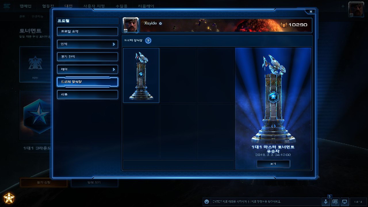 저는 0승으로 마스터 티어 토너먼트 우승컵을 얻었습니다. 래더를 돌릴 때, 저 우승컵이 보이면 괜시리 웃음이 나옵니다.
