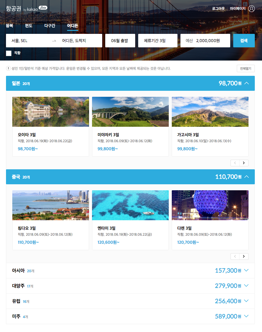 어디든 검색을 하면, 첨부한 이미지처럼 항공료를 가격별로 정렬해서 보여주네요.
