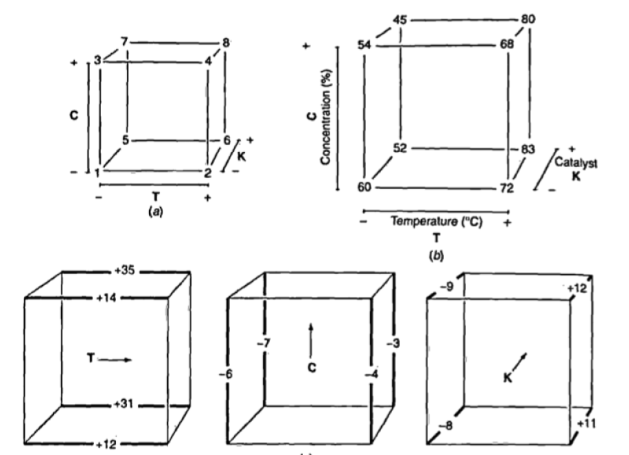각 변수 C,T,K는 -(마이너스) 이거나 +(플러스)로 설정할수있습니다. 즉 변수마다 2가지의 수준이 존재합니다.