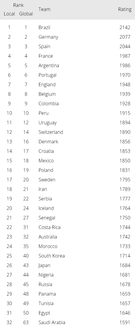 Local 순위는 월드컵 진출 국가 내에서의 순위고, Global 순위는 미진출 국가를 포함한 전체 순위입니다. 한국은 월드컵 최종예선부터 요새 꽤 많이 져오는 바람에 ELO 점수가 많이 떨어져있습니다. 그게 아니더라도 우리나라의 조별리그 편성이 엄청나게 험난하다는건 ELO만으로도 설명이 되는듯 하네요. 남미 예선 방식 덕인지 페루의 점수가 꽤 올라와 있는게 눈에 띕니다. 그나저나 이집트는 왜 저러고 있는지 잘 모르겠고.. 1990년 이후 ELO 랭킹 1위가 월드컵 우승을 차지한 케이스는 2010년 스페인 우승, 단 하나 뿐입니다. 거기다가 이번 월드컵은 남미팀이 우승해보지못한 유럽 월드컵. 브라질이 이번 징크스의 희생양이 될 것인지... 참고로 월드컵 못 나온 나라 중 ELO 점수가 제일 높은 세 나라는 11위 네덜란드, 13위 이탈리아, 15위 칠레. 1