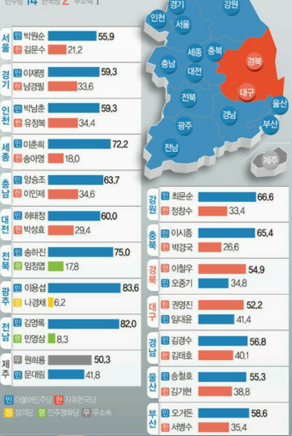 뭔가 좀 이상하죠? 대다수의 (17개중 14 ) 지역에서 출구조사가 득표율보다 낮게 나오고 있습니다. 출구조사가 불편 추정량이라면 이 차이가 거의 비슷해야하는데 대구나 광주, 제주처럼 가장 정치색이 얕거나 높은 지역에서만 득표율>출구조사이고 나머지는 전부 출구조사가 득표율보다 높음을 확인할수있습니다. 다시말해 출구조사가 조금 편의,편향 (bias)되었다고 생각할수있을꺼같습니다. 출구조사를 어케했는지 는 잘 모르겠지만 열성 지지자가 더 출구조사에 응할 가능성이 높다던가..하는 문제를 생각해볼수있을꺼같습니다. 그러면 출구조사와 같이 진행된 대통령 지지율도 조금은 편향되었다고 추론해도 괜찮을꺼같습니다. 거기다가 출구조사의 지지율은 투표를 하지않은 사람들도 고려하지않고있으니깐요... 3줄요약 1. 출구조사의 득표율 > 실제 득표율 2. 17만명에게 조사한 출구조사지만 설문조사자 표본추출을 조금 잘못됬을 가능성이 있음 3. 편향된 추출+ 투표포기자를 포함하면 실제 대통령의 지지율은 출구조사에 비해서 조금 낮을 가능성이 있다. 0