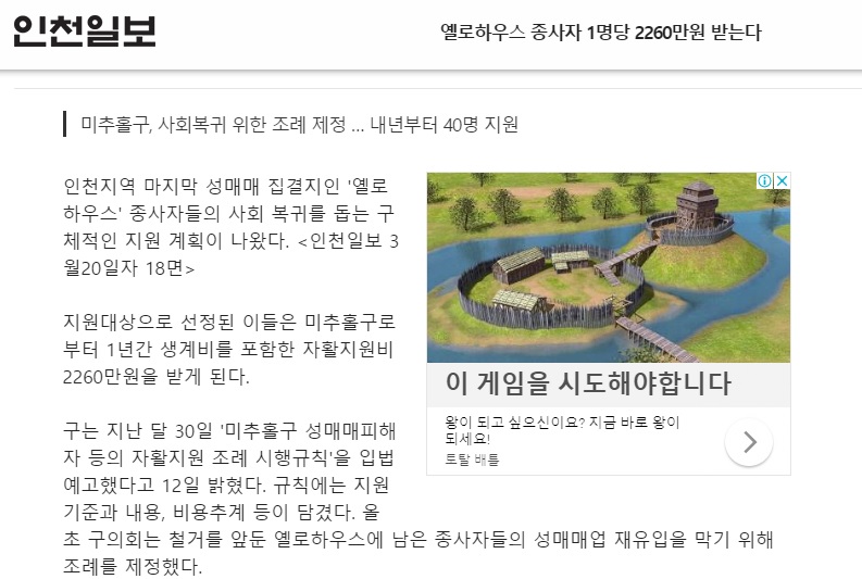 p.s. - 그나저나 저 인천일보 기사 제목 참 저열하게 뽑아 놨네요. [옐로하우스 종사자 1명당 2260만원 받는다] 제목만 보면 퇴직금인 줄 알겠네요. 킁킁.