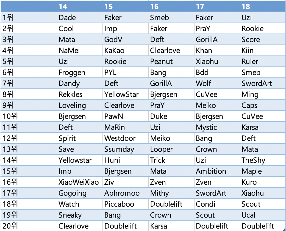 Subject   LOL 라이엇 세계랭킹 14~18 TOP 20 히스토리