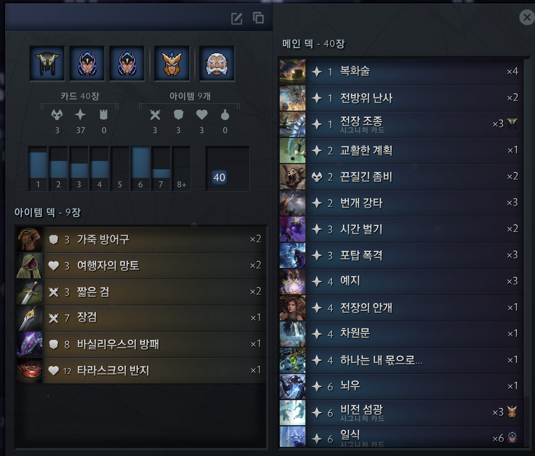 - 카드 뽑다가 망해서 급격하게 청덱으로 마개조된... 청덱인데 의외로 또 4승 1패까지 왔습니다.. - 컨스는 사실 지금 밸런스가 좋다고 말하긴 좀 애매합니다 -.-;; 확팩도 나오고 좀 안정기 겪기 전까지는 드래프트가 훨씬 재밌는듯.. - 하스를 즐긴분들 기준으로 드래프트 모드에서 중요한건 > 카드 다 뽑은뒤에.. 덱을 새로 편집하는 구조라서 하스처럼 개똥카드라도 30장안에 들어가서 눈물을 머금고 뽑고.. 그런거 없습니다.. 개똥카드들은 그냥 덱에서 시원하게 버려서 압축합시다 > 기본카드는 매우 적지만 (색상별 영웅 하나와 무기/방어구/악세 기본 아이템 1종..) 이 기본 아이템은 안뽑아도 언제나 편집이 가능합니다.. > 하스는 '개개인에게 무작위 3장' 을 보여주는 방식이지만 아티팩트는 '최초에 팩 하나를 까서 12장을 보여주고 2장 픽' (이 12장은 일반적인 카드팩 룰과 동일하게 8 일반, 3 희귀, 1 레어 등급 카드가 나오며. 그중 2장은 아이템. 1장은 영웅이 됩니다.) 그 후에 10장을 받는건 '다른 누군가가 최초에 받은 12장중 2장을 골라가고 남은 10장' 구성 중 하나를 무작위로 DB에서 꺼내서 받게 됩니다. 이걸 남은 2장까지 반복하게 되는데요.. 바꿔말하면 -.- '픽 순서가 뒤로 갈수록 남들이 구리다고 생각해서 거르고 거른 카드들...' 이 남습니다............. 진짜 좋다 싶은건 그냥 1~2픽에서 무조건 집어야... - 현재 밸런스는 영웅 밸런스가 좀 안맞는게 큰데.. 뭐 벨브에서 패치 하겠지 하고 나름 즐기고 있는중.... - 영웅들 시그니쳐 스킬 쓰거나.. 잘 큰 영웅이 버프 받고 썰어버릴때는 정말 MOBA 게임들 하는 느낌이 팍팍 납니다 - -;; TCG에서 이 느낌을 준다는게 참 신기신기... - 저 위에 올린 덱도 사실.. 초중반에 밀리지만 최소한의 파밍만 하면서 루나가 일식 충전 한뒤에 중반 타이밍부터 일식으로 필드 클리어하고 이기는 패턴이라... - 왠지 1~2년뒤에 이 시스템 좀 더 다듬어서 라이엇에서 롤 TCG 출시하면 초대박 날거 같다는 생각이 자꾸 드는데 기분탓이겠지... 먼가 하드한 부분들을 좀만 더 고쳐서 약간만 대중적으로 가면 IP가 괜찮다는 가정하에선 잘 될거 같은데 왠지 그게 라이엇 생각이... 0