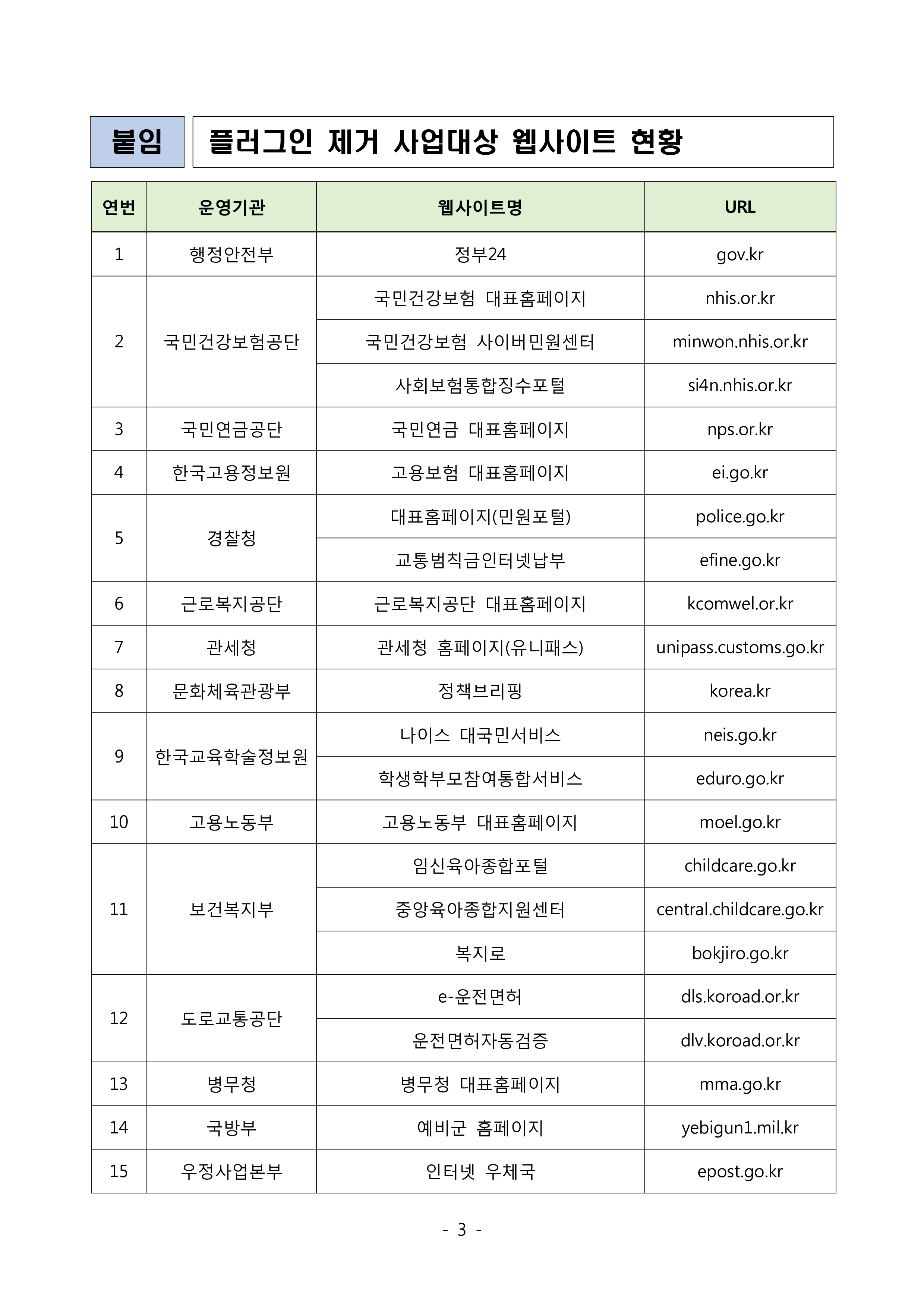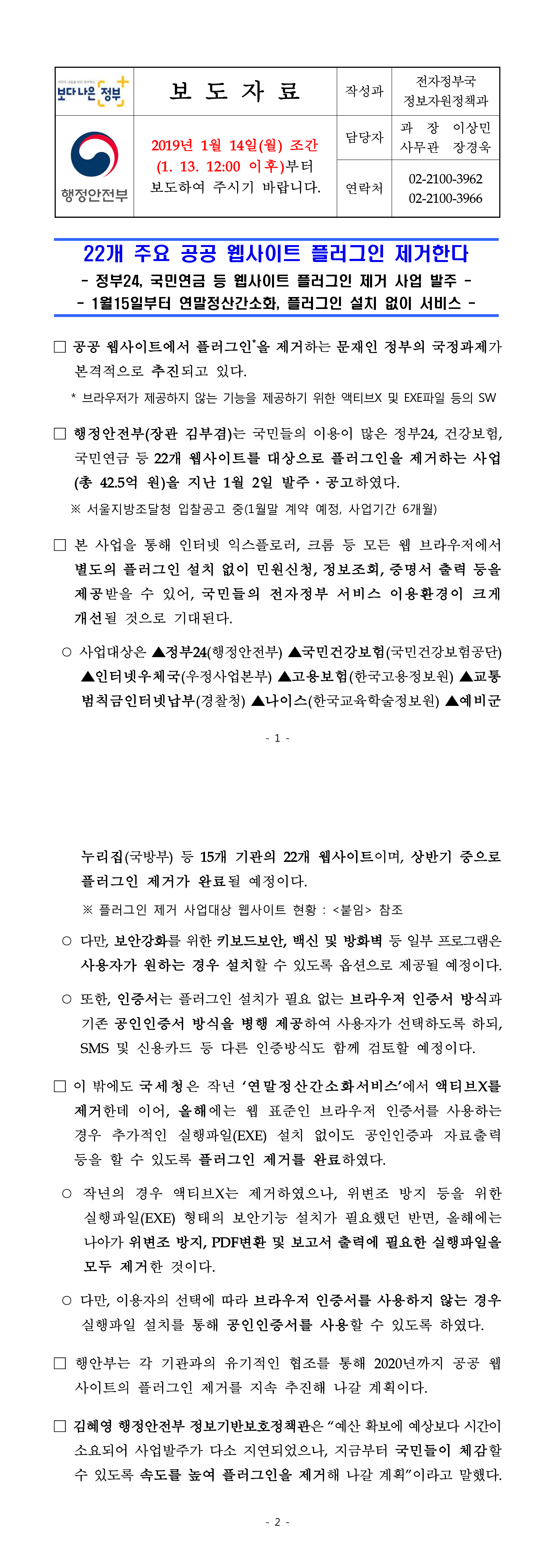 이번에 정부에서 위에 첨부한 것과 같은 보도자료를 발표하였습니다. 지금까지는 정부 기관 웹사이트에서 민원업무를 보려면 키보드 보안, 백신 및 방화벽, 위변조 방지, PDF 변환 프로그램 등을 ActiveX 또는 EXE 플러그인 방식으로 반드시 각각 모두 설치해야 했지만, 앞으로는 이 플러그인들의 설치를 모두 선택할 수 있게 하거나 아예 제거한다고 합니다. 또, 기존에 사용하던 플러그인 기반 공인인증서 외에 웹 브라우저 내장기능으로 구현한 인증서를 사용할 수 있게 하며, 기타 다른 본인인증 방식도 추가를 검토하겠다고 하는군요.
