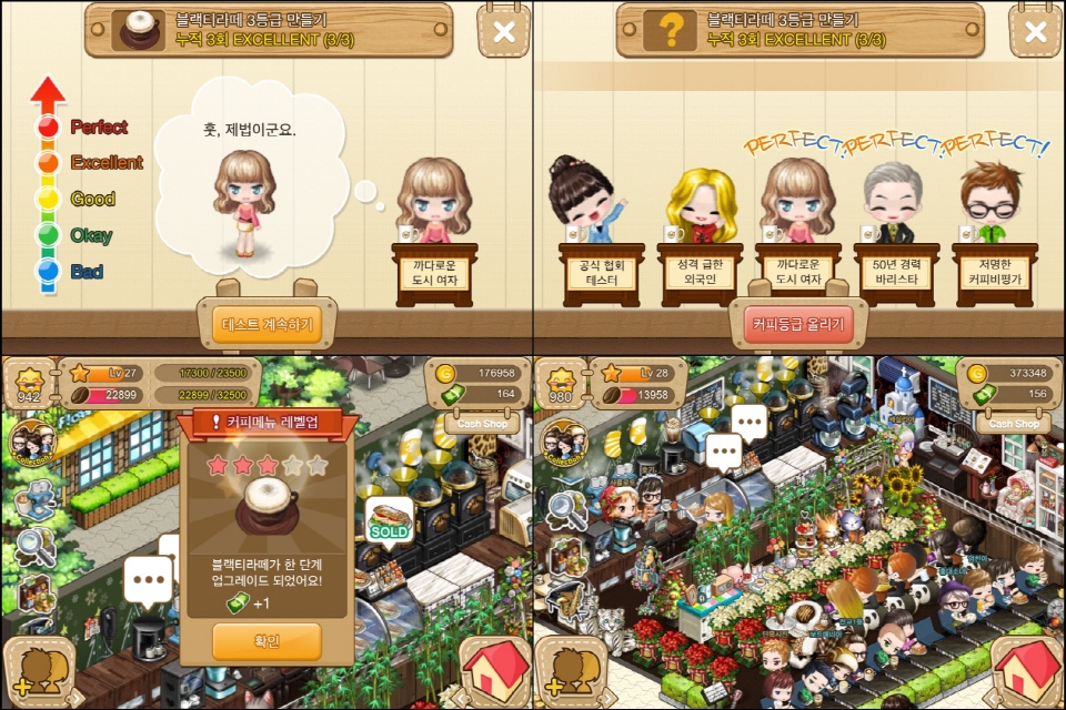 그런데 문제는 이렇게 시험을 쳐서 등급이 올라가면 주는 보상은 별 개수가 하나에서 두 개 올라가면 골드, 두 개에서 세 개로 올라가면 1캐쉬,  세 개에서 네 개가 되면 골드, 가장 높은 등급으로 별 다섯 개가 되면 2캐쉬. 고작 이 정도였습니다. 무과금 유저들에게는 그것도 어디냐라고 할 지 모르겠지만, 커피 메뉴 자체가 등급이 올라간다고 돈을 더 벌게 해 주거나 하는 건 아니었지요. 그걸 생각하면 참으로 보상이 짠 겁니다.