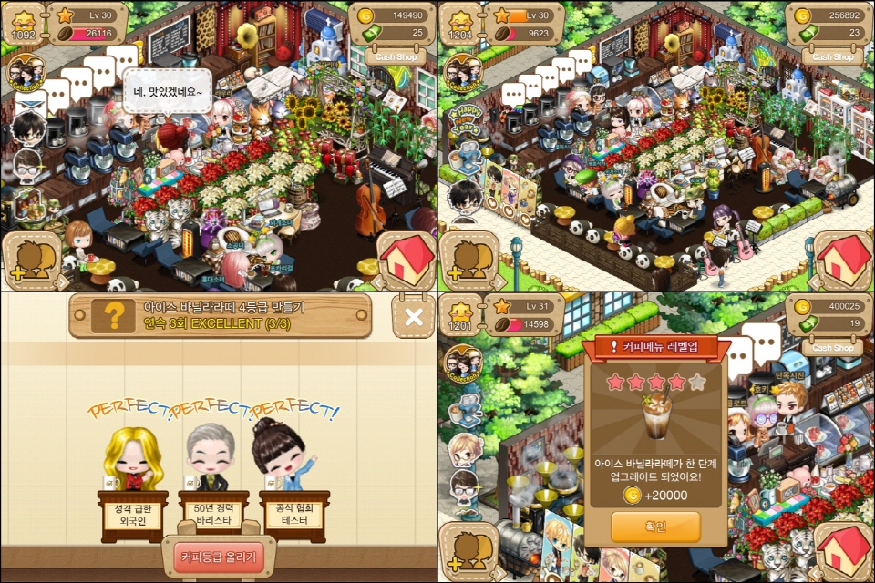 앞서 말한 것처럼, 좀 더 레벨이 잘 오르고 돈을 빨리 벌 수 있는 상위 커피 메뉴를 얻기 위해서 커피 시험은 피할 수 없는 일이었습니다. 그리고 상위 커피 메뉴를 얻기 위해서는 최소한 그 전의 커피 메뉴가 별 세 개는 되어야 했기 때문에 저는 울며 겨자 먹기로 최소한 두 번의 시험을 칠 수밖에 없었습니다.