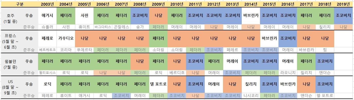 만약에 2020년에도 이 셋이 우승 행진을 이어간다면 저 그랜드 슬램 표를 세로로 바꿔서 만들어야 하나 고민이 되는군요.