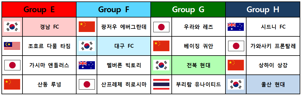E조는 지난시즌 우승팀 가시마가 뉴캐슬 제츠를, 산둥 루넝이 하노이 FC를 각각 이기고 막차를 탔습니다. 경남이 말레이시아, 일본, 중국 원정을 가게 되었습니다.