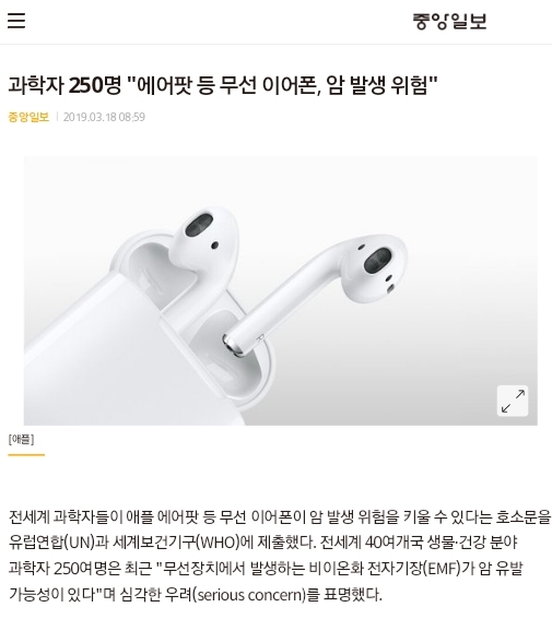 블루투스의 전파세기는 wifi에 비해 한참 낮습니다. 10m 수신 거리를 가지는 블루투스 class 2는 2.5mW이고 4G 휴대폰이 200mW 정도. ICNIRP와 IEEE는 조건에 따라 다르지만 대략 0.08W/kg수준에서 허용치를 정하고 있는 것 같습니다. 공학 전공이 아니어서 정확하지는 않지만 50kg 여성이 4W 정도가 허용한계라고 대충생각해보면 에어팟이 쏘는 non-ionizing radiofrequency radiation으로는 몸에 위해한 정도가 되기 어려워 보입니다.