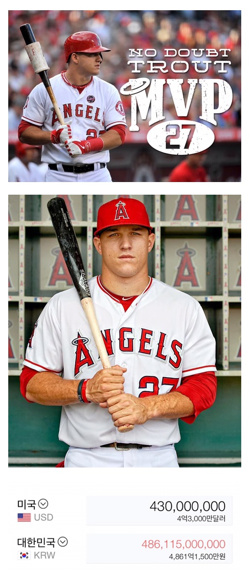 Jeff Passan BREAKING: Star center fielder Mike Trout and the Los Angeles Angels are finalizing a record-breaking 12-year contract worth more than $430 million, sources familiar with the deal tell ESPN. Details: 안녕하세요 김치찌개입니다! 마이크 트라웃이 에인절스가 12년 430m 연장 계약을 했다고 합니다 저만 금액이 낮아보이는걸까요.. 0