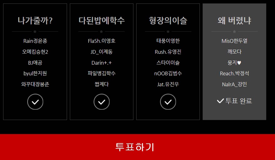 9002 게임아프리카 BJ 멸망전 투표좀 부탁드립니다!(기프티콘 있음) 9 니생각내생각b 19/03/26 5711 0