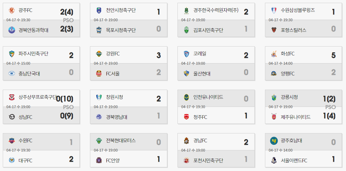 한편 K리그1팀 간의 경기였던 수원-포항 전은 염기훈 선수의 결승골로 수원이 승리했고, 상주-성남 전은 승부차기에서 한바퀴를 다 돌고 또 다시 첫번째 키커가 나오는 대혈투 끝에 상주가 승리했습니다. 그리고 지난경기 오심의 앙금이 남았을 강원-서울 전은 박주영의 2골에도 불구하고 강원이 3-2 승리를 거두었습니다.