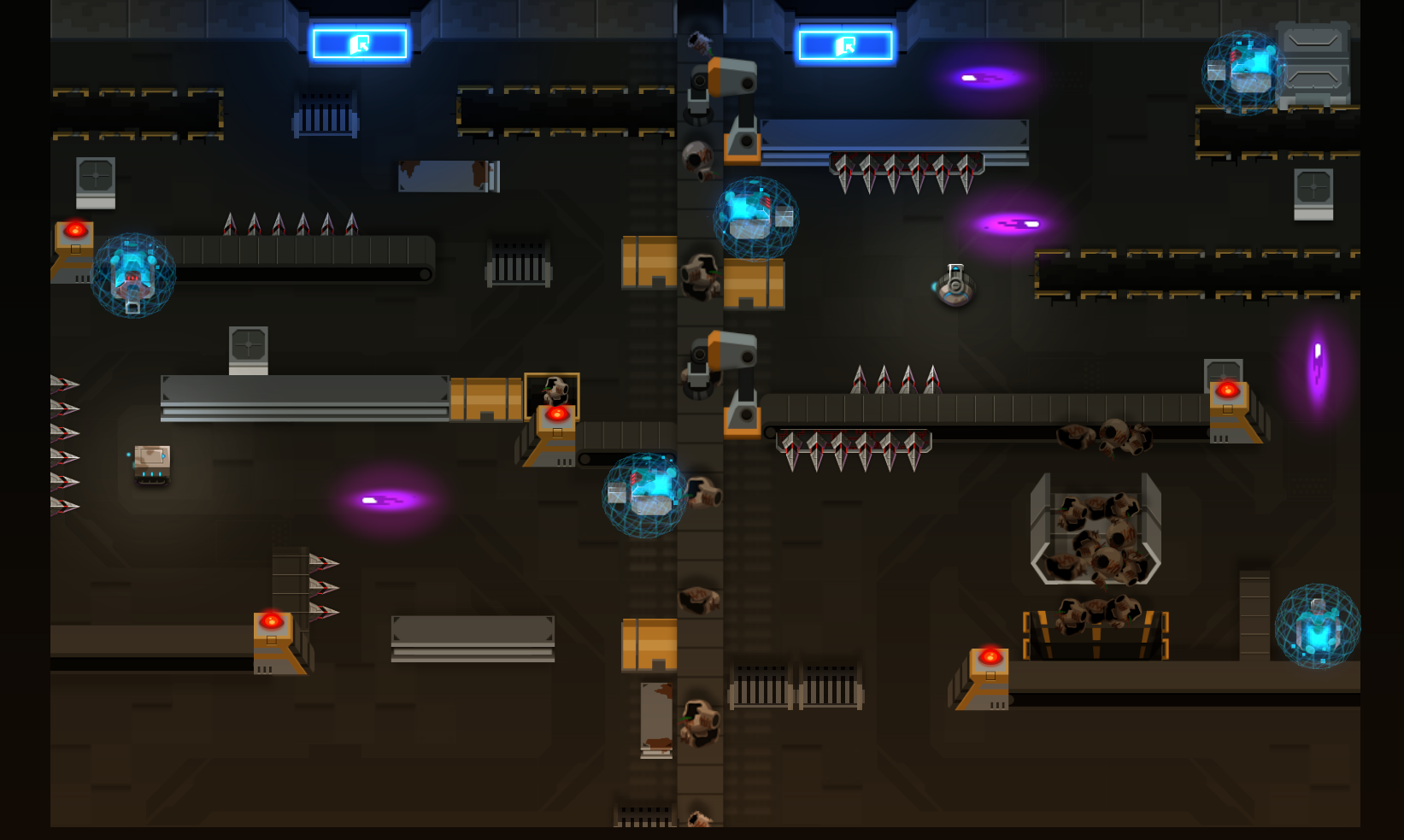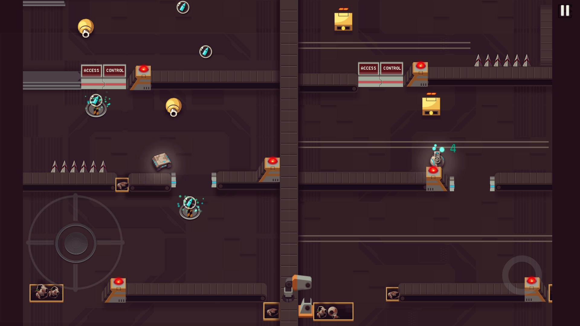 하나의 조작으로 2개의 화면에 있는 캐릭터를 동시에 보고 조작 하면서 스테이지의 목표를 달성해야 합니다.