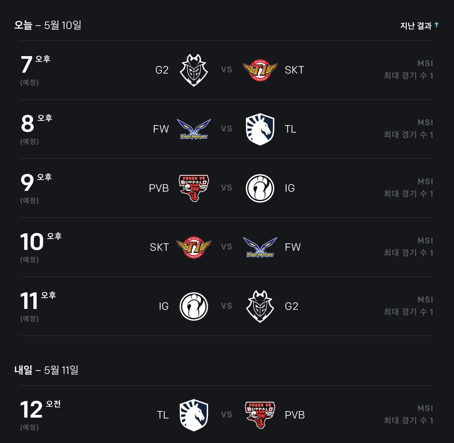 일정과 참가팀 로스터입니다. 자정 이후의 심야경기를 포함해서 하루에 6경기를 치릅니다. 마지막 날에는 타이브레이크가 있을지도 모르지만요. 오늘부터 5일동안 여섯 팀 간에 풀리그를 두 바퀴 돌려 팀당 총 10게임을 치른 결과에 따라 상위 4팀이 4강 토너먼트에 진출합니다. 드디어 시작이네요! 우리나라를 대표하는 SKT를 응원하는 열기가 무척 뜨거울 듯합니다. 덥맆-코장 파이팅 ㅋㅋ 2