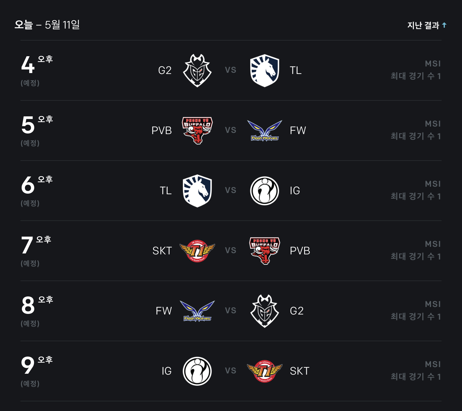 일정과 참가팀 로스터입니다. 자정 이후의 심야경기를 포함해서 하루에 6경기를 치릅니다. 마지막 날에는 타이브레이크가 있을지도 모르지만요. 5일동안 여섯 팀 간에 풀리그를 두 바퀴 돌려 팀당 총 10게임을 치른 결과에 따라 상위 4팀이 4강 토너먼트에 진출합니다. ————— 오늘은 오후 4시부터 시작합니다. 마지막 경기인 월드챔피언들 간의 게임이 몹시 기대됩니다. 1