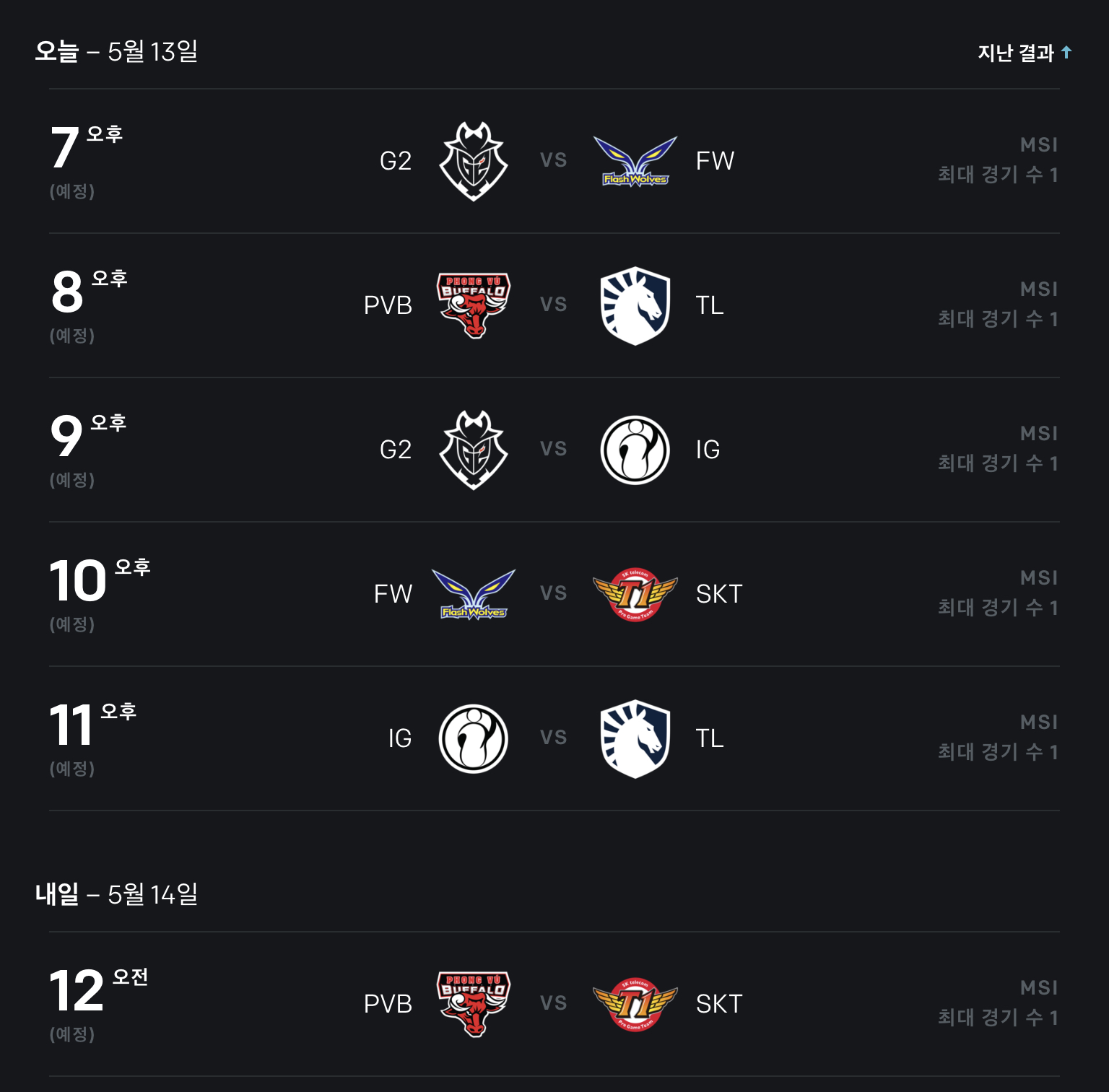 일정과 참가팀 로스터입니다. 자정 이후의 심야경기를 포함해서 하루에 6경기를 치릅니다. 마지막 날에는 타이브레이크가 있을지도 모르지만요. 5일동안 여섯 팀 간에 풀리그를 두 바퀴 돌려 팀당 총 10게임을 치른 결과에 따라 상위 4팀이 4강 토너먼트에 진출합니다. ————— 저녁 7시에 시작합니다. 오늘은 SKT의 대진이 비교적 수월합니다. 아무래도 2승을 거둘 가능성이 유력한 상황. 반대급부로 오늘마저 패배를 기록하면 누구도 의심치 않았던 토너먼트 진출이 위협받게 됩니다. 0