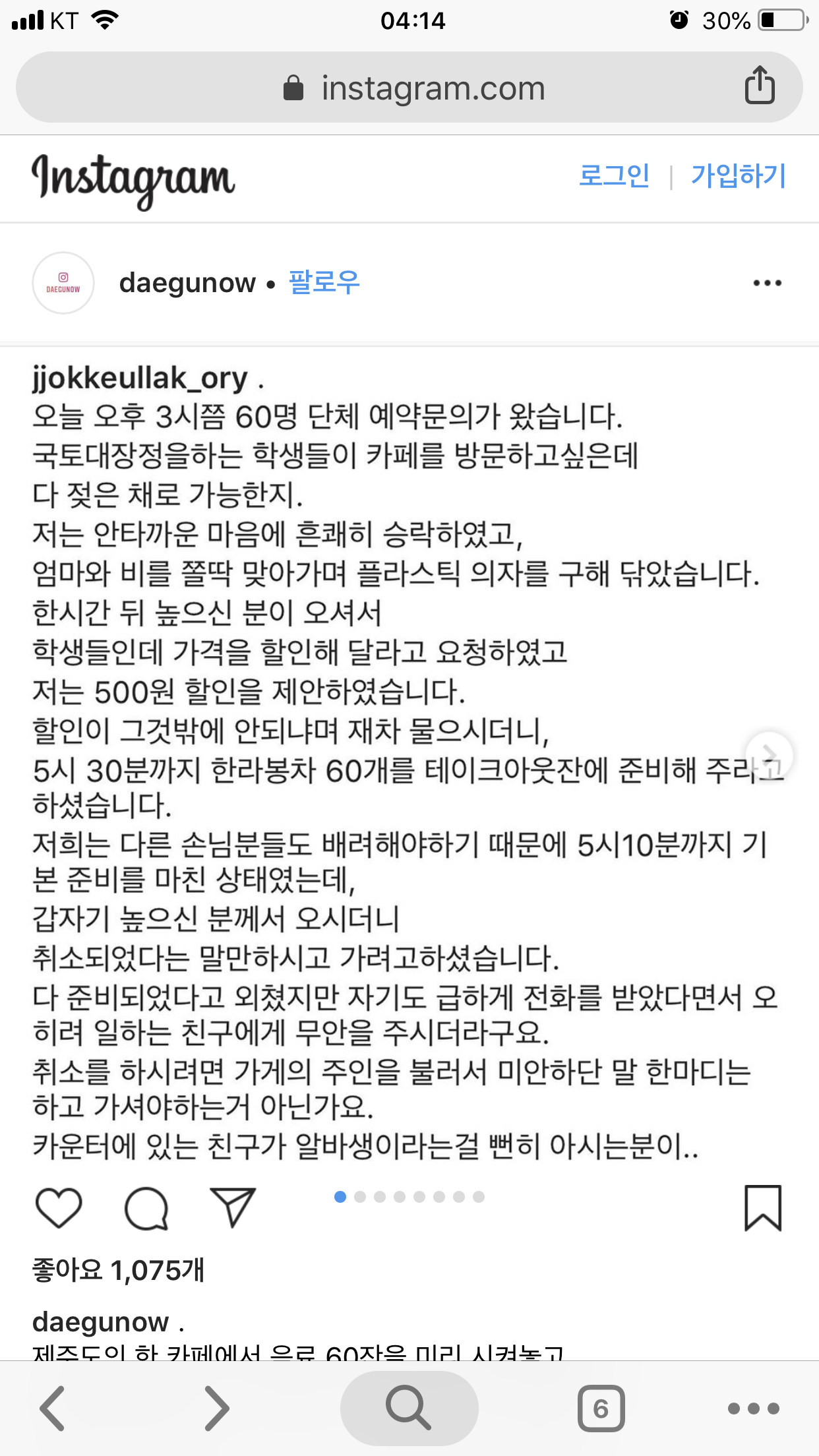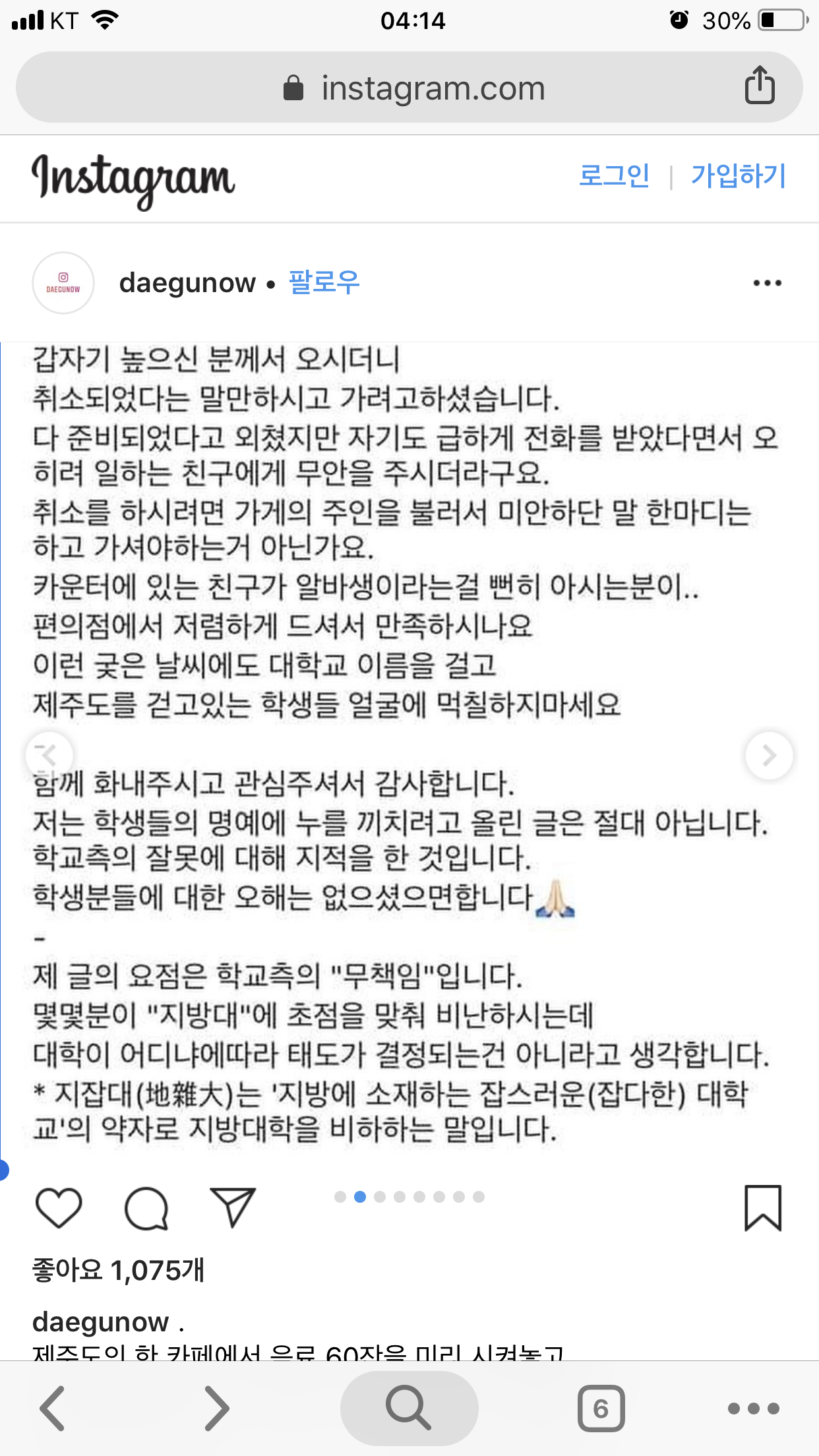 대구대 총학 사과문 전문입니다 안녕하십니까 대구대학교 노쇼 사건의 중심에 있는 미소총학생회 총학생회장 구근회입니다. 이러한 불미스러운 일로 찾아뵙게 되어 대단히 송구스럽습니다. 7월 19일 금요일 14시 30분 경 국토 대장정 중 학생들이 쉬면서 따뜻한 차를 한잔할 수 있는 장소를 찾던 중, 모 카페에 사장님께서 딱한 사정을 아시고 선뜻 장소를 제공해 주시기로 하셨습니다. 그러하여 17시 30분까지 차 60잔을 준비해 주신다고 하셨고, 의자까지 따로 준비를 해주셨습니다. 그러나 태풍 다나스로 인한 기상악화로 원래 예정이었던 카페까지의 거리가 무리일 것이라 판단을 한 저희 총학생회에서는 중도 철수를 하기로 하여 당일 17시 02분에 부총학생회장이 카페 근처 대기 중이던 국토대장정 담당 교직원에게 전화로 주문 취소를 요청하였습니다. 전화 내용 전문입니다. A: 선생님, 현재 날씨 때문에 카페까지 가는 것은 무리입니다. 혹시 예약취소가 가능하겠습니까? B: 카페까지 못 온다고? 그럼 알겠어 A: 선생님, 근데 저희가 예약 30분 전인데, 가능하시겠습니까? B: 어. 당연하지 이 사람아 아직 결제하지 않았어. A: 에이 선생님 그건 아닙니다. 만약 벌써 준비를 했다면 저희가 먹던 먹지 않던 결제는 해야죠. B: 어어 알았다. 그건 내가 알아서 할게 A: 네 선생님 꼭 부탁드립니다. 주문 취소 이후 저희 총학생회는 학생들을 숙소로 이동시켰습니다. 그 후 23시 09분경 영남대학교 총학생회 임원에게 해당 사건에 대한 소식을 듣게 되었습니다. 그리하여 저희는 사건을 인지하게 되었고, 일이 잘못되었다는 것을 알게 되었습니다. 그리고 담당 교직원에게 전화하여 사건에 대한 사실 여부를 확인하였습니다. 다음은 전화 내용 전문입니다. A: 선생님. 오늘 저녁에 카페에서 어떻게 해결하셨습니까? B: 어. 그거 그냥 취소한다고 했어. A: 지금 SNS에서 대구대학교 노쇼라고 난리가 났습니다. 어떻게 된 겁니까? B: 나는 그때 당시 손님이 많아서 알바생한테 “대구대학교 주문 취소할게요.”라고 하니 알바생이 “준비가 됐습니다.”라고 하더라. 그리고 그 알바생이 다른 일을 하길래 나는 나왔어. A: 아이고…선생님…일단 제가 다시 알아보고 전화드리겠습니다. 이 통화가 끝나고 모 카페 사장님의 입장을 확인하기 위해 SNS 계정으로 메세지를 보냈습니다. 그러자 사장님께서 학생들의 잘못은 없다. 담당자와 이야기를 하고 싶다. 라고 하셨고, 대화를 나누고 싶다면 내일 오픈 시간에 맞춰 오라고 하셨습니다. 그리하여 오늘 오전 11시경 제주 모 카페에 사건 관련 교직원과 함께 이번 사건에 대한 진심 어린 사과와 노쇼에 따른 배상을 해드리기 위해 방문하였습니다. 사장님께서는 국토대장정에 참여하고 있는 학생들이 입고 있는 옷에 대구대학교와 영남대학교 모두 적혀있기 때문에 어디 학교가 예약을 한 것인지 확인하지 못하였고, 양측 학교에 모두 전화를 하여 확인하려 하였으나, 연락을 받지 않아 확인하지 못한 상태였다고 말씀하셨습니다. 이후 사장님께서는 그러한 글을 올리시고 이번 사건으로 불편을 느낀 양측 학교의 학생 모두에게 사과의 말씀을 전했습니다. 그리고 해당 교직원을 포함한 저와 총학생회 임원은 사장님께 진심 어린 사죄의 말씀을 드렸고, 정말 감사하게도 사장님께서 사과를 받아주셨습니다. 또한 배상에 있어 저희는 여러 차례 배상을 해드리겠다고 거듭 말씀드렸지만, 사장님께서는 정중하게 배상을 거절하셨습니다. 갑작스러운 기상 악화로 힘들어하는 학생들을 보며 한시라도 빨리 복귀를 해야겠다고 판단하였고, 이러한 판단으로 인해 생긴 예약 취소에 있어 끝까지 확인하지 못한 점은 제 불찰입니다. 다시 한번 사장님께 사죄드립니다. 국토대장정 영남대학교 팀은 이 일과 전혀 무관합니다. 사건의 개요를 정확하게 모르는 SNS상에서 무분별하게 와전 시켜 영남대학교를 모욕하는 일이 저희로 인해 발생하였습니다. 현재까지도 영남대학교에 대한 폭언과 욕설이 난무하고 있습니다. 이번 일로 인해 영남대학교를 모욕하는 일이 더 없었으면 하는 바입니다. 이번 국토대장정을 함께 추진하며 고생한 영남대학교 총학생회와 영남대학교 모든 학생분에게 진심으로 사과의 말씀을 드립니다. 마지막으로 이번 일로 인해 불편함을 느끼신 대구대학교 학우분들께 사죄의 말씀을 드립니다. 준비 기간이 길었던 만큼 기대도 많이 하였고, 걱정도 많이 되었습니다. 학교를 대표하여 국토대장정을 이끄는 역할을 하는 만큼 더욱더 신중하게 일을 진행하였어야 했지만, 예상치 못한 상황에 많이 당황하였고, 그렇기 때문에 판단력이 많이 흐려졌던 것 같습니다. 교직원의 잘못된 행동에서 논란이 되었지만, 학생대표인 저에게도 역시 확인을 끝까지 하지 못한 잘못이 정말 크다고 생각합니다. 다시 한번 사죄의 말씀을 드립니다. 마지막으로 저희에게 많은 배려를 해주신 카페 사장님께 감사드리며, 동시에 사죄드립니다. 또한 대구대학교, 영남대학교의 명예를 복구시키기 위해 최선을 다할 것을 약속드립니다. 긴 글을 읽어주셔서 감사합니다. ㅡㅡㅡㅡㅡㅡㅡㅡㅡㅡㅡㅡㅡㅡㅡㅡㅡㅡㅡㅡㅡ