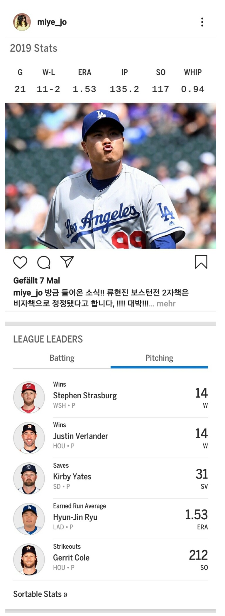 안녕하세요 김치찌개입니다! 많은 기대(?)를 모은 7월 15일 보스턴전 2자책(7이닝 6K 2실점)이 비자책으로 정정되었습니다 어제 최대고비였던 콜로라도 경기에서 6이닝 1K 0실점으로 평균자책점을 1.66까지 낮추었는데요 비자책으로 정정되면서 1.53까지 내려갔습니다 라이브볼시대 이후 최고 기록은 1968년 밥 깁슨의 1.12입니다 1.53은 역대 2위 기록으로 1985년 드와이트 구든과 동일하네요 참고로 가장 많은 실점을 했던 콜로라도전 7실점을 제외하면 1.03입니다~ 대단합니다 류현진선수 2