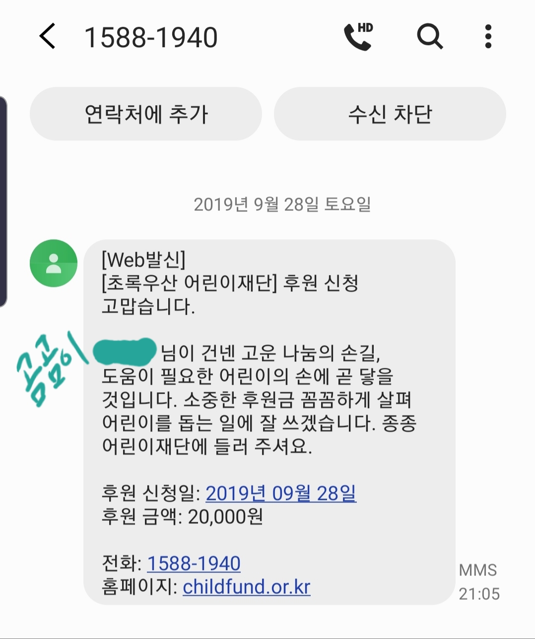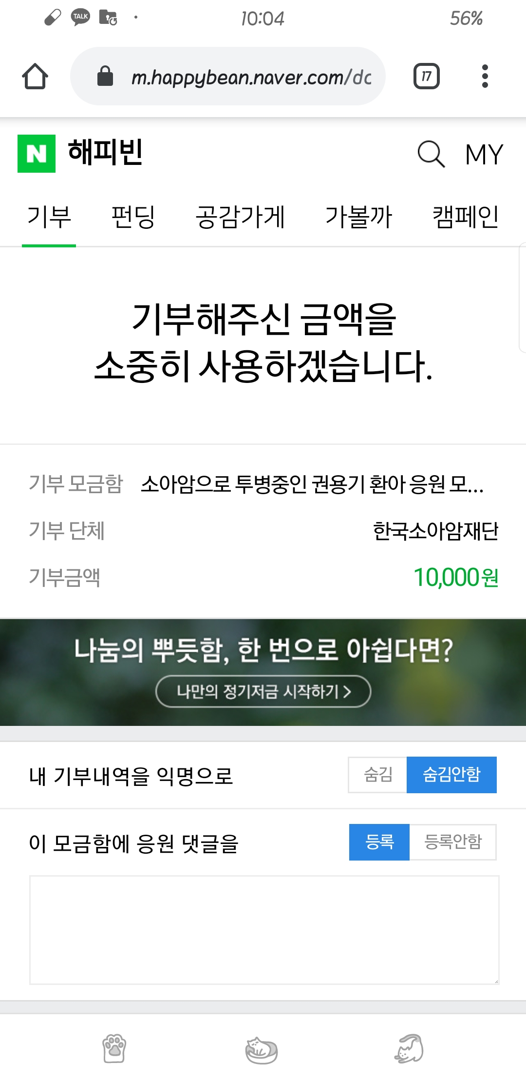 꼭 성경 말씀(오른손이 하는 일을 왼손이 모르게 하라. 마태복음 6:3)이 아니더라도, 좋은 일은 숨겨서 하는게 미덕처럼 여겨지는 경향이 있는 것 같습니다. 하지만 이렇게 작은 손길들이 이어지는 것이 보인다면, 그것을 보고 또다른 누군가가 영향을 받아 또다른 작은 손길을 펼칠 수 있지 않을까요? 부끄러워하지 마시고, 기부 인증을 올려주세요.
