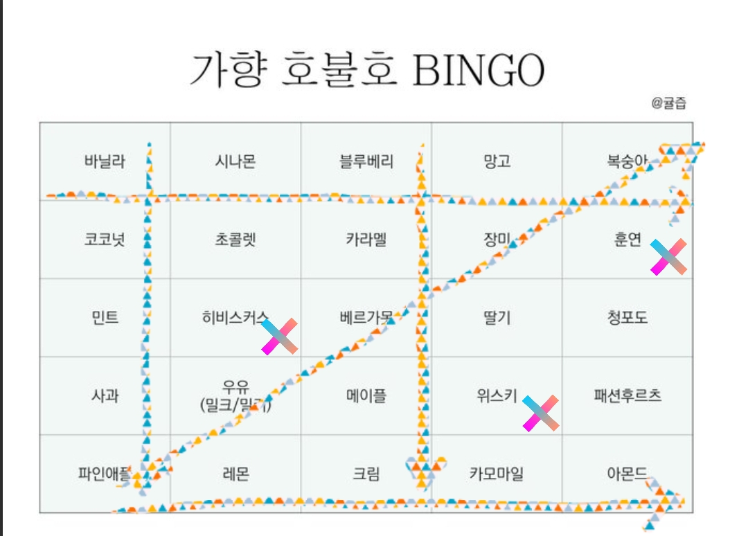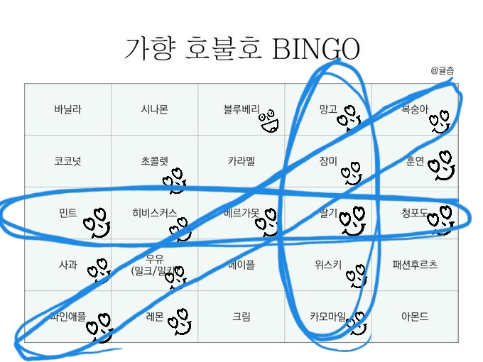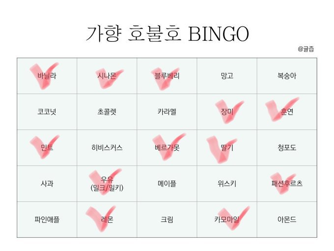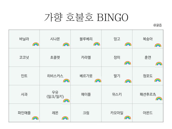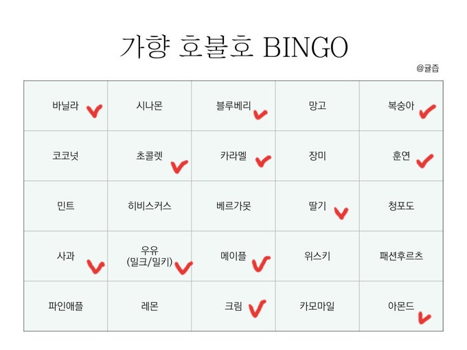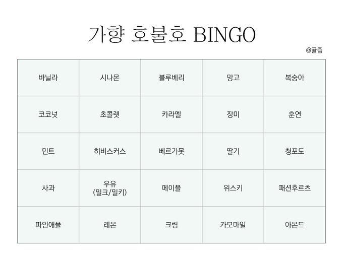 트위터에서 주워온 빙고에요 출처: https://twitter.com/gyul_zoo/status/1178935745542795264?s=09 가향 차 중에서 자기가 좋아하는 향은 무엇인가요?? 음료로는 좋아하는 데 차 가향으로는 별로 안 좋아하거나 안 마셔본 차는 제외해서 2빙고밖에 없네요 0