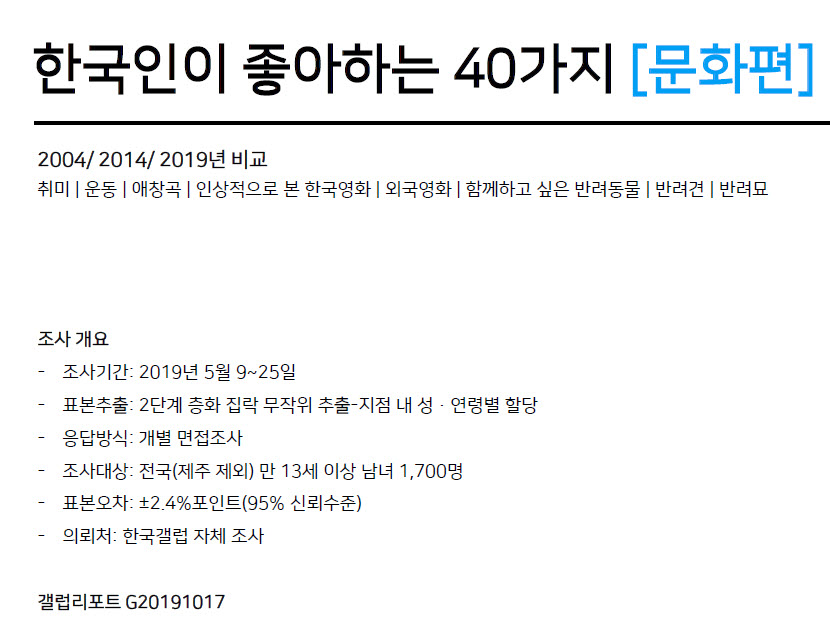 Subject   한국인 좋아하는 40가지(문화) - 한국갤럽(2004, 2014, 2019)