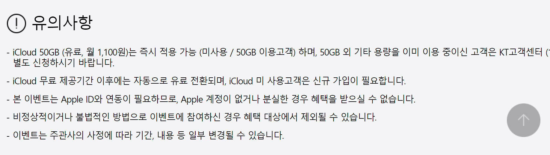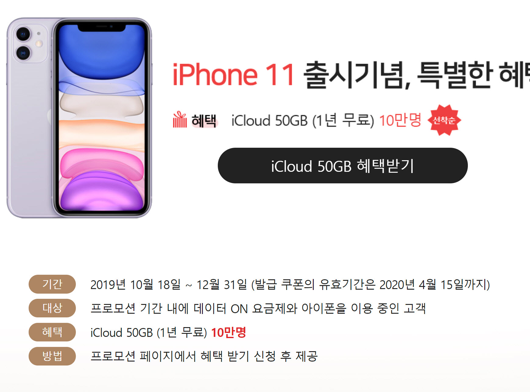 https://my.kt.com/etc/ICloudinfo.html 전에도 했었는데, 새 아이폰 출시 기념으로 또 하네요. 전에 같은 이벤트로 이미 무료로 사용 중이신 분도 중복 혜택 적용이 됩니다.(혜택 적용 기간이 늘어남) 다만, 주의사항에 적힌 것처럼 50GB 초과하는 다른 정액제 쓰시는 분은 전화로 문의하셔야 합니다. *새 아이폰 구입과 상관없이, KT이용자면서 아이클라우드 이용자면 혜택 받을 수 있습니다. (선착순) 2