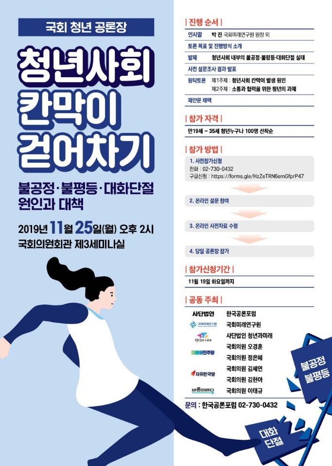 온라인 신청 폼 (신청폼 링크 수정) 전파해 달라는 주변의 요청을 받고 올립니다. 맥락을 잘 모르니 쇼에 그칠지 유의미한 무언가로 이어질지는 모르겠는데... 언제나 그렇듯이 어찌될지는 결정된 게 아니지요. 검색해보기로는 올해 초에 한국공론포럼이 '의회 중심의 공론장 운동'을 표방하고 출범했다고 하네요. 저와 같은 20대^_^ 분들 중 관심 있으신 분들은 한 번 참석해보셔요. 35세 이상 분들은 참석 가능한 주변인들에게 전파해주시면 감사하겠습니다. 2