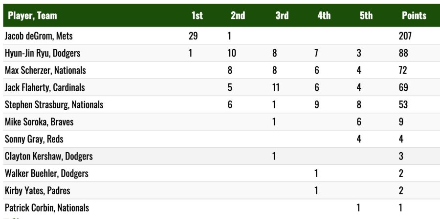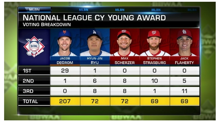 1위는 예상대로 디그롬(207표)이 받았고요 3위는 슈어저(72표)네요