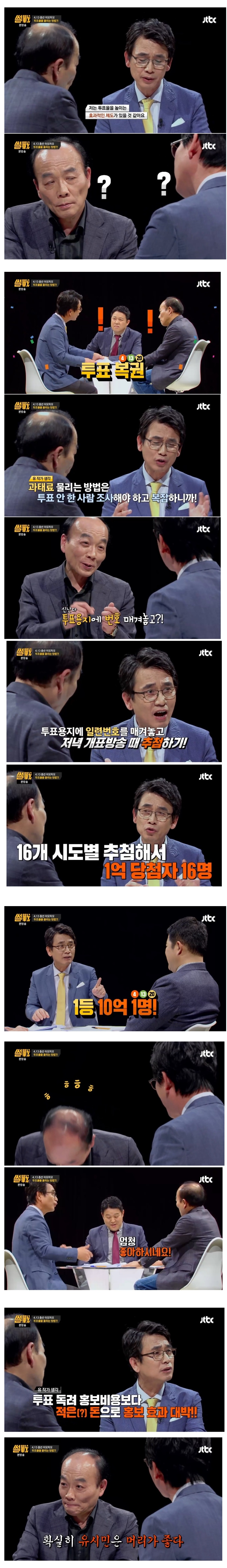 [그러면서도 두 사람은 결국 이를 \'농담\'으로 정리했다. 전 변호사는 \"아이디어는 좋은데 투표 같은 진지한 정치행위를 사행행위와 결합시킨다는 것은 으스스하다\"고 지적했다. 유 작가 역시 \"나도 그 점이 걸린다. 결국 그냥 해본 말\"이라고 웃어 넘겼다.]
