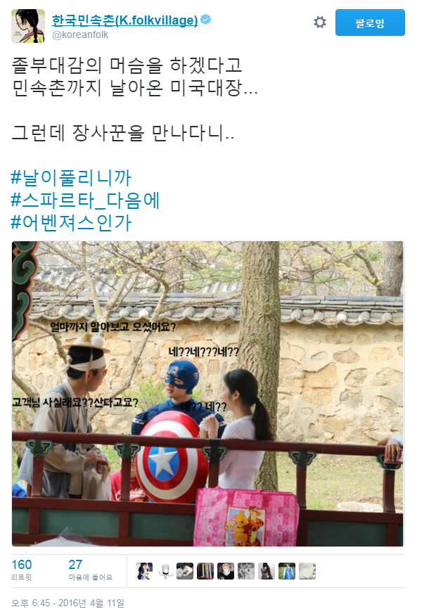 | Subject | 캡틴아메리카가 한국민속촌에 온 이유 |