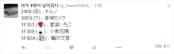 해석 2468 - 환상향 소속 치르노 30E9 - 드림 아카데미 소속 오토시로 세이라 1F353 - 스타 라이트 학원 소속 호시미야 이치고 1F359 - μ's 소속 코이즈미 하나요 1F4DA - 346 프로덕션 소속 사기사와 후미카 ps.1F397 - Remember 0416 후원 소식을 보고 찾아보았던 것이었습니다. 0