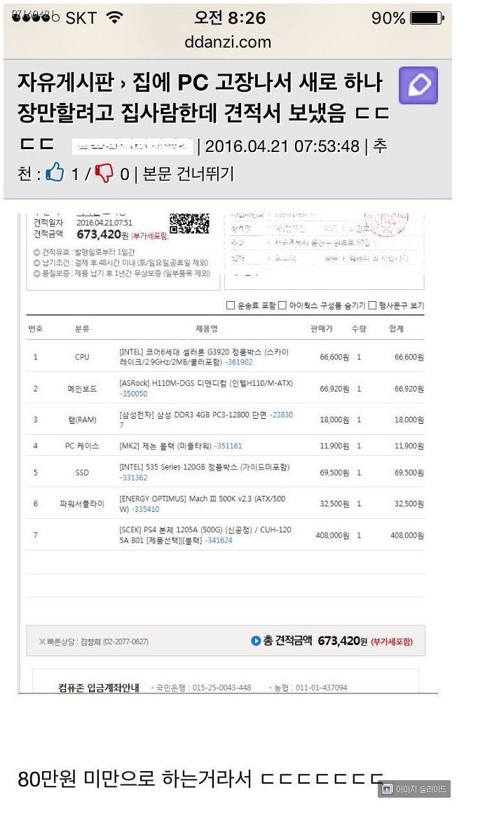 남편 : 싸늘하다. 가슴에 비수가 와 꽂힌다. 하지만, 손은 눈보다 빠르다. 부품견적을 CPU에 하나, 메인보드에 하나, 램에 하나... 아내 : 동작그만, 밑장빼기냐? ..... --------------------------------------- 총각 여러분, 결혼이 이렇게 스릴 넘치는 일상의 연속입니다. 결혼 꼭 하세요. 두번 하세..아..아닙니다. 1