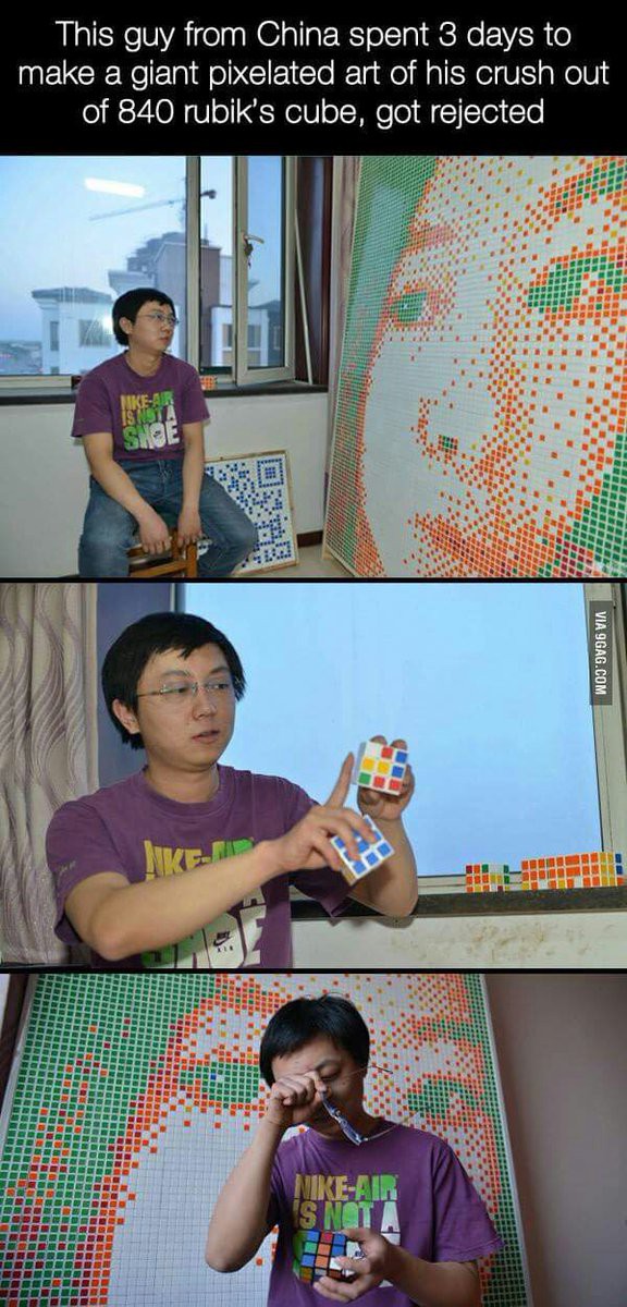 무려 3일간 자신의 짝사랑 여성을 위해 루빅큐브 840개를 조합해 초상화를 만든 그. 그녀는 그의 정성에 감동했고, 그를 찼다. 0