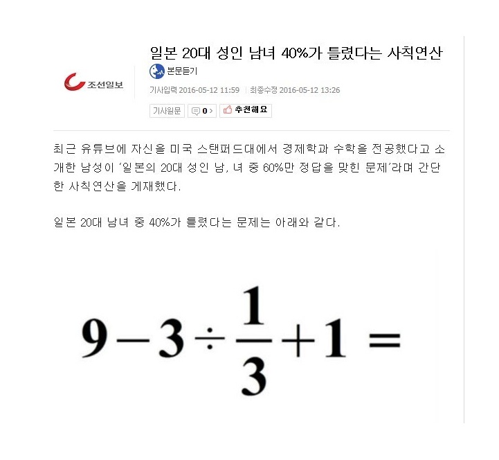 일본 성인 40%가 틀렸다는 사칙연산 문제 0