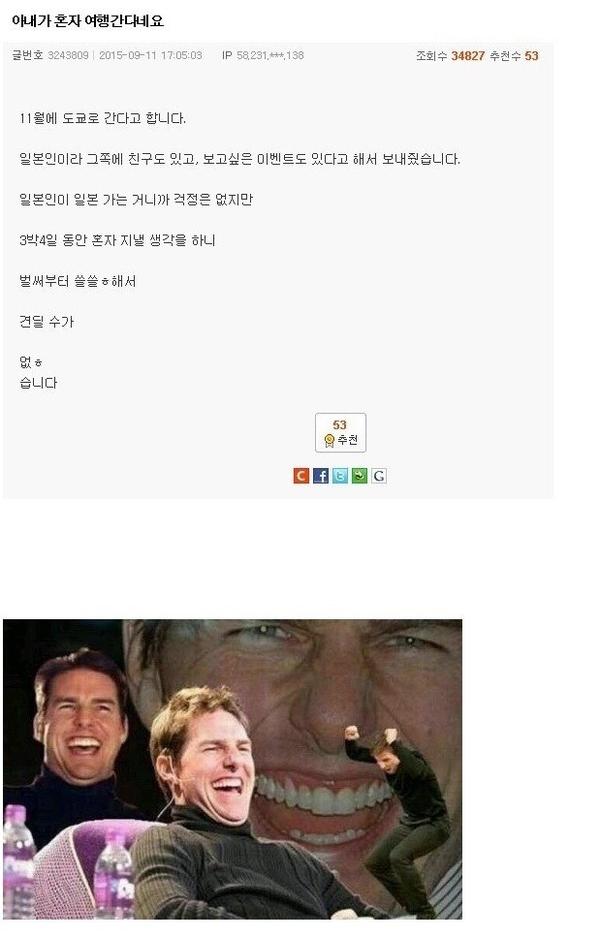 | Subject | 아내가 혼자 여행 떠날때 남편반응 |