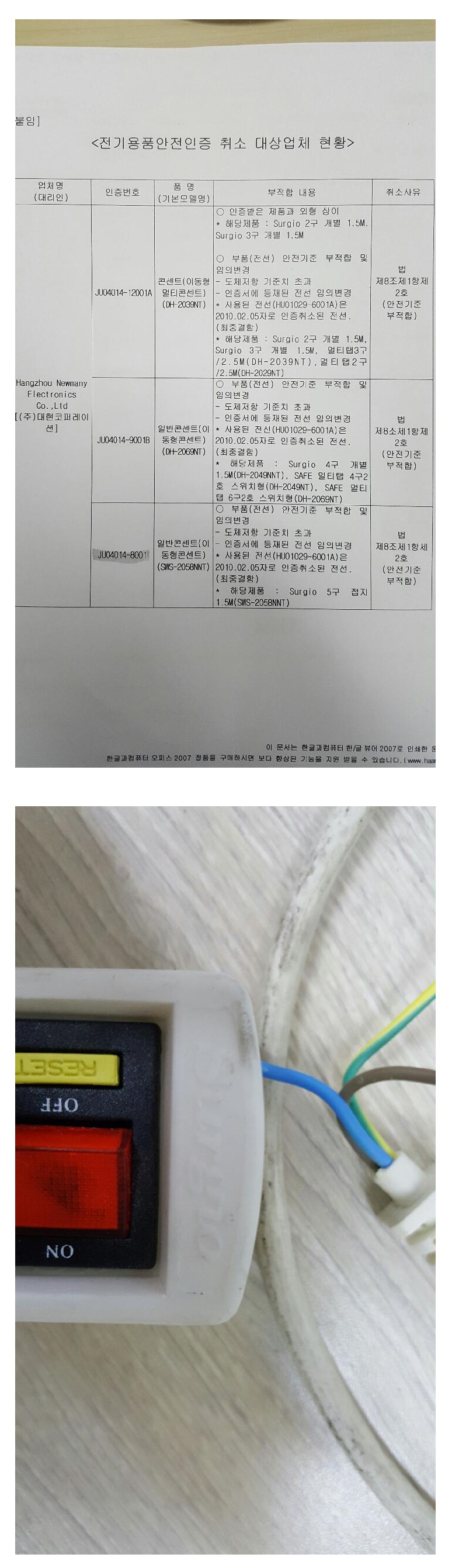지금 사용중이신 멀티 콘센트 메이커를 확인 한번 해 주시기 바랍니다... 현재 전기안전인증이 취소 된 메이커 중에서 상당히 많이 판매가 된 업체가 포함이 되어 있어 글 올립니다... 아랫사진을 보시면 멀티 콘센트 끝에 영어로 'Surgio' 라고 적혀 있는걸 보실 수 있으실 겁니다... 요즘 멀티 콘센트 가격 얼마하지 않으니 하나 새로 장만 하셔서 안전사고에 대비 하시기 바랍니다... 다음주부터 이 녀석 때문에 저희 사옥에서 사용중인 수백,수천개의 멀티 콘센트를 일일히 확인하고 교체 하기로 업무계획 세워 놨네요...ㅠ.ㅠ 0