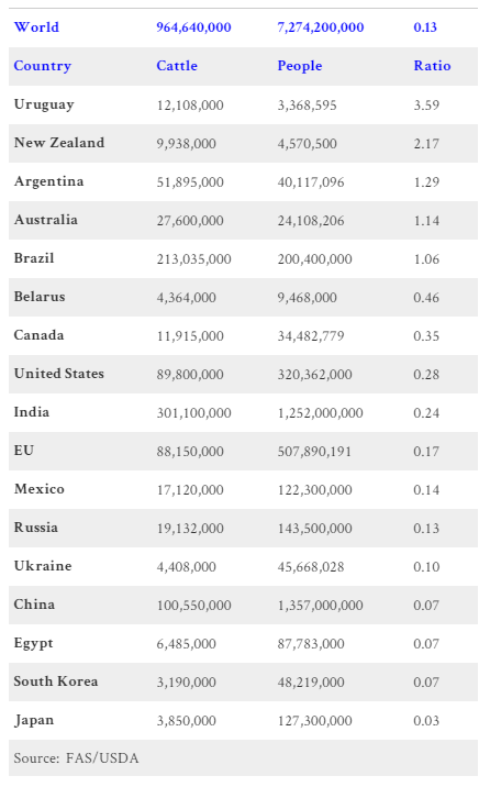 당연히 소의 마리수가 적어서 그렇지요. 그만큼 소가 먹고 살 곳이 없다는 이야기이기도..... 우르과이, 뉴질랜드, 아르젠티나, 오스트레일리아, 브라질 까지는 사람보다 소가 많은 국가입니다. 이 중 뉴질랜드, 오스트레일리나는 의사보다 수의사가 돈을 더 많이 번다는 이야기도 있을 정도이지요. (뉴질랜드는 소 뿐만 아니라 양도 많아서..) 0