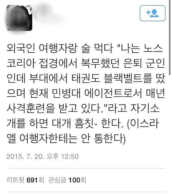 저는 노스코리아 접경인 강원도에서 복무했던 은퇴 군인인데, 군에서 태권도 블랙벨트를 땄으며, 현재 민병대 에이전트 계약 기간이 만료되어 사회에서 일을 하고 있습니다.
