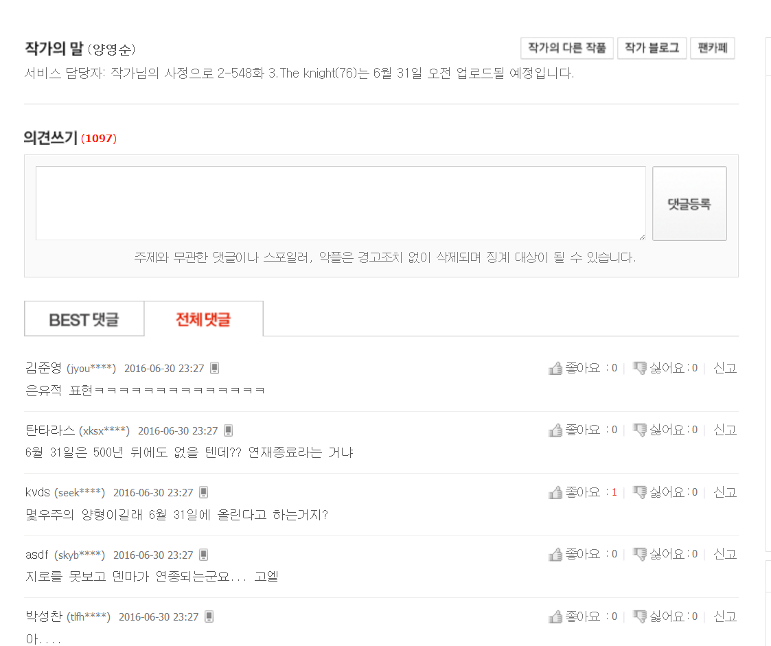 6월 31일 오전에 업로드라니 연재 종료라는 뜻인가... 서비스 담당자의 실수겠지만 댓글창은 혼돈 파괴 망가_-;; 저도 올해 말이면 30대 되기 싫다고 12월 32일 이러고 있을 듯. 0