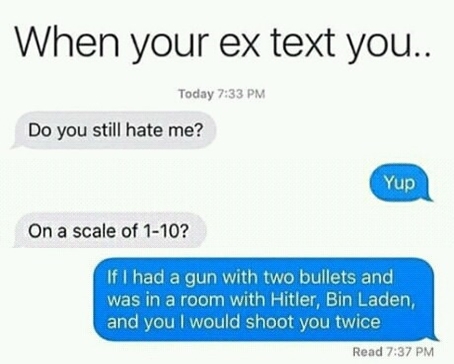 아직도 내가 싫음? 물론. 점수를 매긴다면? 나한테 총알 두 발이 있고 히틀러하고 빈 라덴하고 니가 같은 방에 있다면 나는 너를 두 번 쏠 것임. 0