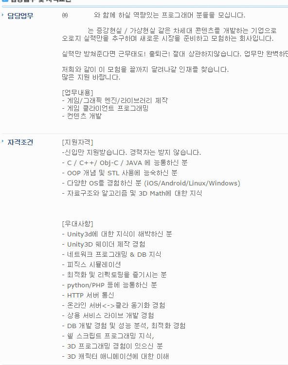 실력은 신입이면 안되고 경력직이어야 합니다.