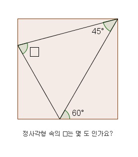 1. 정사각형의 좌하-우상으로 대각선 하나 긋고, 오른쪽 아래 모서리에서 왼쪽 위로 직선 하나 긋습니다. 각도는 바닥과 60도 되게요. 여러 각도를 구하다보면 양 변이 75도인 이등변삼각형을 발견할 수 있습니다. 왼쪽 사선과 60도로 새로 그은 선(이등변 삼각형의 밑변)이 수평인 것 같이 보이기 때문에, 이를 증명해내면 답인 75도를 쉽게 구할 수 있습니다.