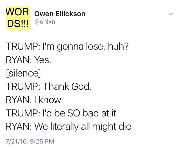 트럼프: 나 지겠지, 그지? 라이언 (폴 라이언-미국 하원의원, 공화당 1인자): ㅇㅇ -------정적------- 트럼프: 휴 다행이야 라이언: ㅇㅇㅇㅇ 트럼프: 나 진짜 (대통령) 넘 못할거야 라이언: 진짜 우리 말 그대로 다 죽을지도 몰라 ㅋㅋㅋㅋㅋㅋㅋㅋㅋㅋㅋㅋㅋ ㅋㅋㅋㅋㅋ 앜ㅋㅋㅋ 제발 이 트윗이 성지가 되길 바랄뿐입니다 ㅠㅠㅋㅋㅋㅋ 0