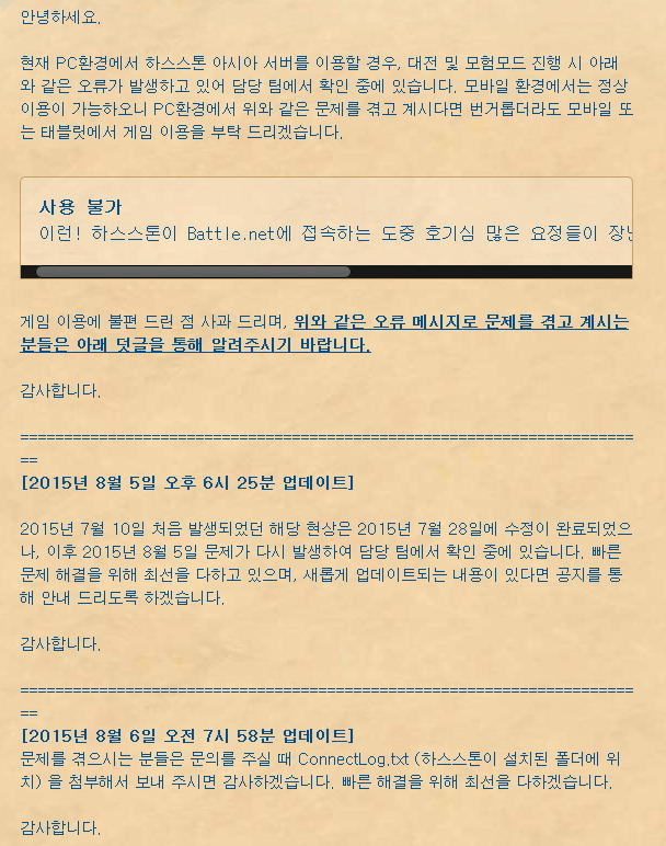 지금 상당수의 유저가 며칠째 아예 플레이를 못 하고 있는데, 블리자드 코리아의 아름다운 대답은...